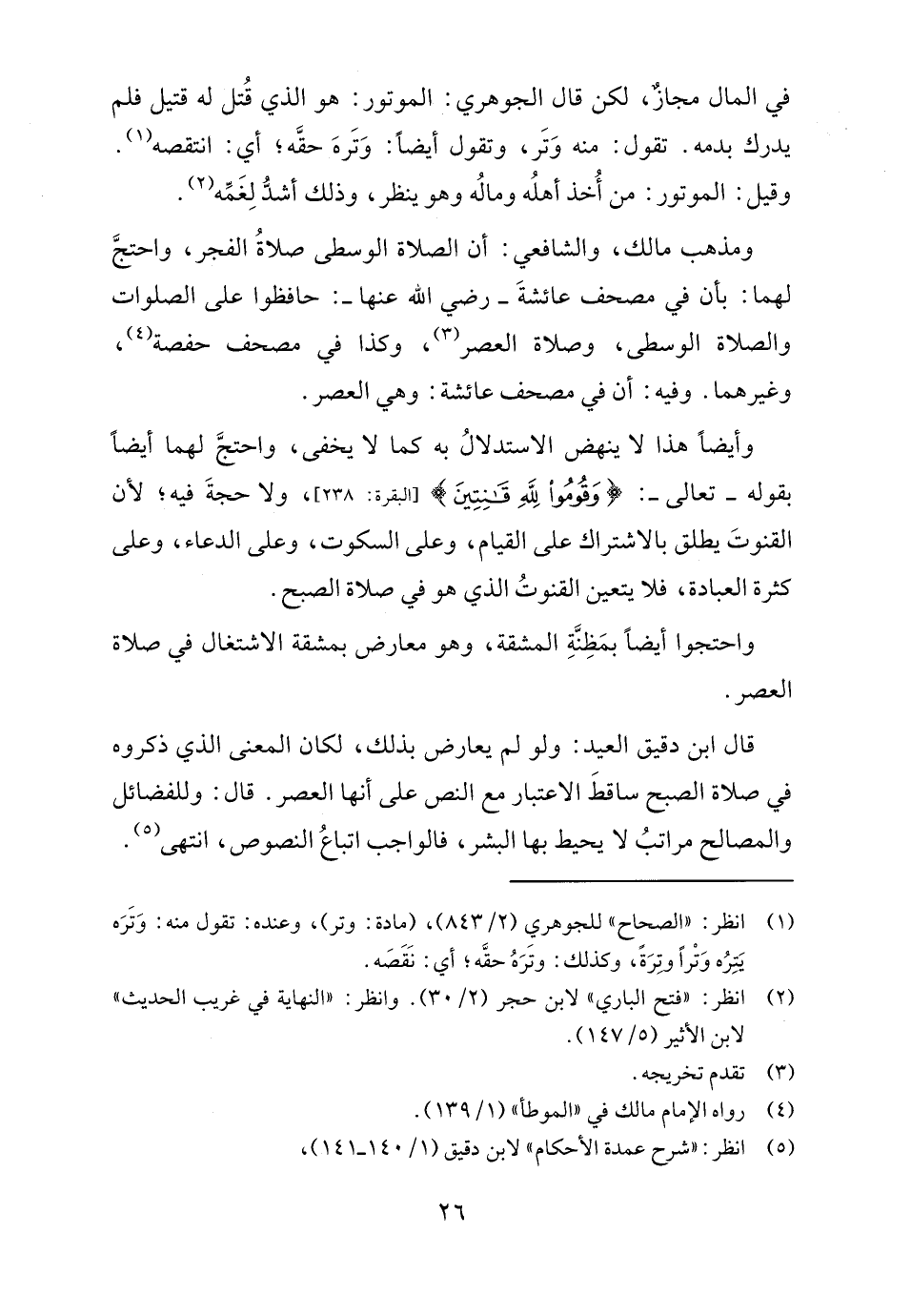 ومذهب مالك، والشافعي: أن الصلاة الوسطى صلاةُ الفجر، واحتجَّ لهما: بأن في مصحف عائشةَ - رضي الله عنها -: حافظوا على الصلوات والصلاة الوسطى، وصلاة العصر (٣)، وكذا في مصحف حفصة (٤)، وغيرهما. وفيه: أن في مصحف عائشة: وهي العصر.