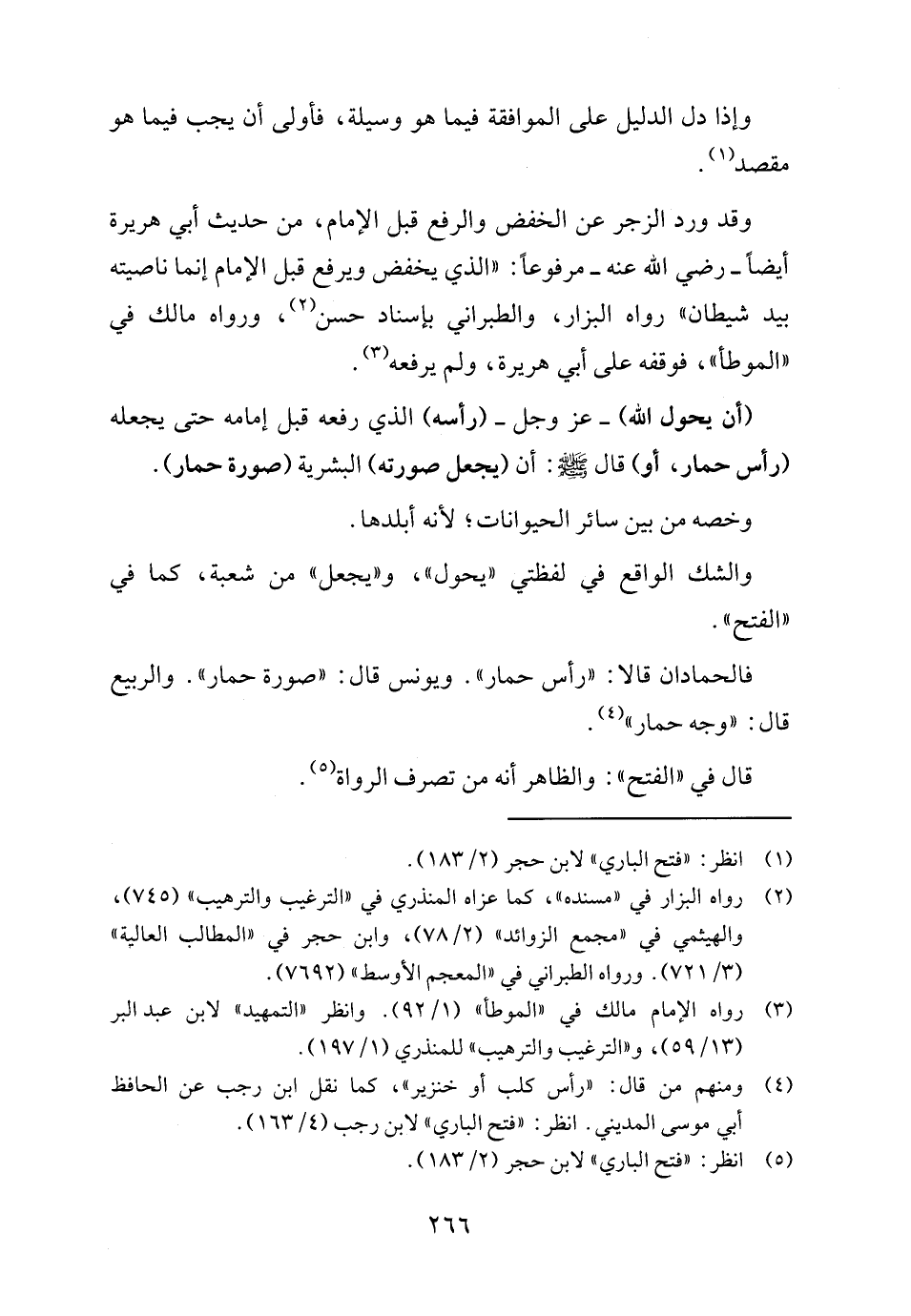 وقد ورد الزجر عن الخفض والرفع قبل الإمام، من حديث أبي هريرة أيضاً- رضي الله عنه - مرفوعاً: "الذي يخفض ويرفع قبل الإمام إنما ناصيته بيد شيطان" رواه البزار، والطبراني بإسناد حسن (٢)، ورواه مالك في "الموطأ"، فوقفه على أبي هريرة، ولم يرفعه (٣).