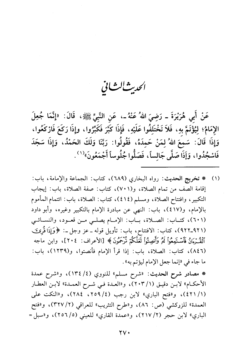 عَنْ أَبِي هُرَيْرَةَ - رَضِيَ اللهُ عَنْهُ -، عَنِ النَّبِيِّ - صلى الله عليه وسلم -، قَالَ: "إنَّمَا جُعِلَ الإِمَامُ؛ لِيُؤْتَمَّ بهِ، فَلاَ تَخْتَلِفُوا عَلَيْهِ، فَإذَا كبَّرَ فَكَبِّرُوا، وإِذَا رَكَعَ فَارْكَعُوا، وَإِذَا قَالَ: سَمِعَ اللهُ لِمَنْ حَمِدَهُ، فَقُولُوا: رَبَّنَا وَلَكَ الحَمْدُ، وَإِذَا سَجَدَ فَاسْجُدُوا، وَإَذَا صَلَّى جَالِساً، فَصَلُّوا جُلُوساً أَجْمَعُونَ" (١).
