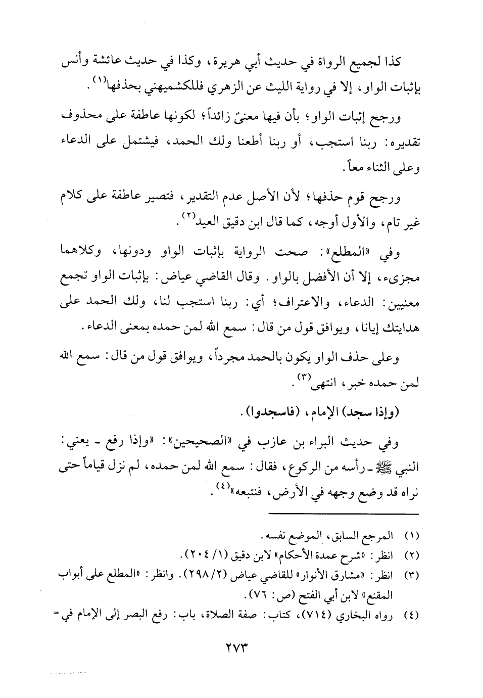 وفي "المطلع": صحت الرواية بإثبات الواو ودونها، وكلاهما مجزىء، إلا أن الأفضل بالواو. وقال القاضي عياض: بإثبات الواو تجمع معنيين: الدعاء، والاعتراف؛ أي: ربنا استجب لنا، ولك الحمد على هدايتك إيانا، ويوافق قول من قال: سمع الله لمن حمده بمعنى الدعاء.
