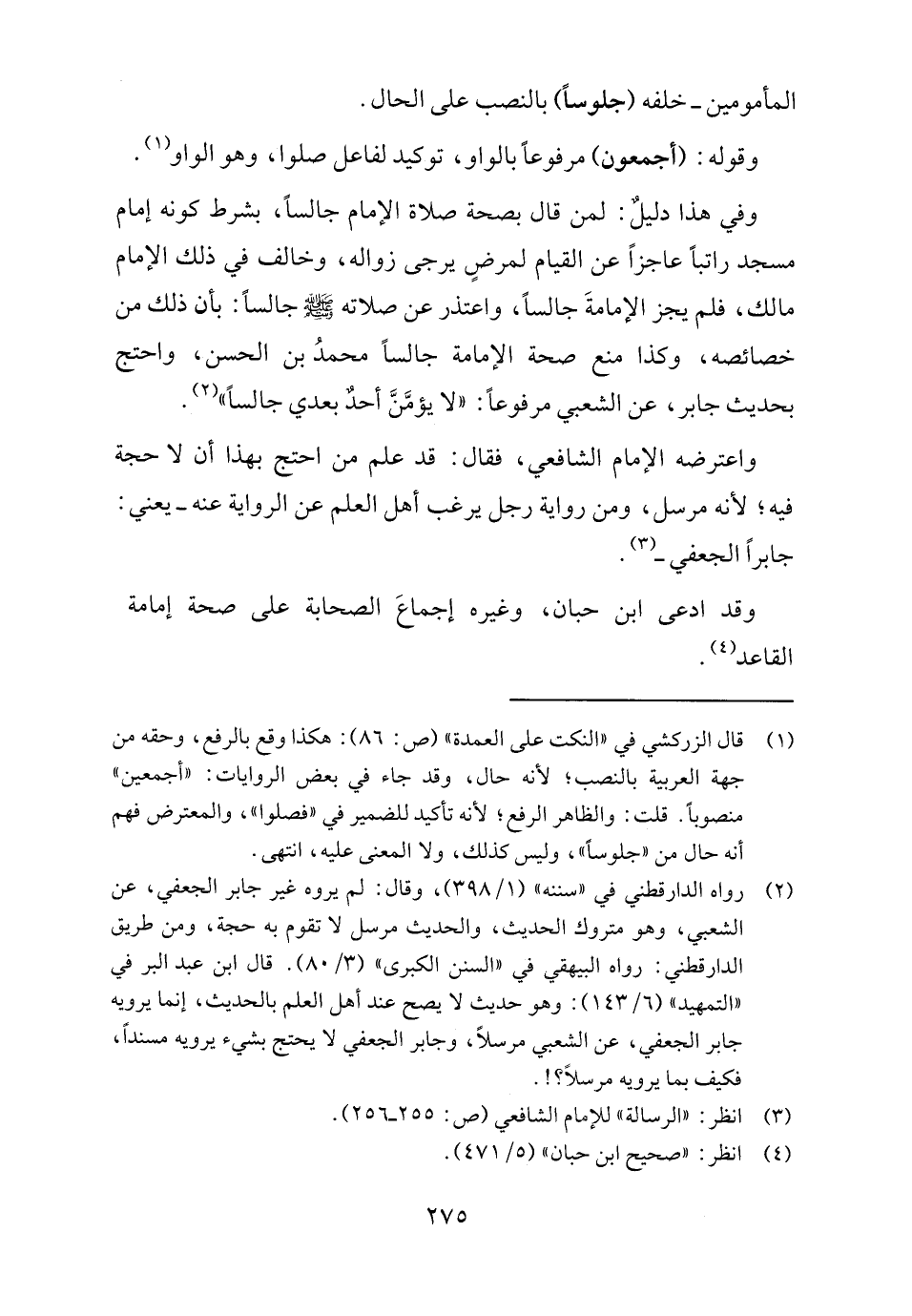 (١) قال الزركشي في "النكت على العمدة" (ص: ٨٦): هكذا وقع بالرفع، وحقه من جهة العربية بالنصب؛ لأنه حال، وقد جاء في بعض الروايات: "أجمعين" منصوباً. قلت: والظاهر الرفع؛ لأنه تأكيد للضمير في "فصلوا"، والمعترض فهم أنه حال من "جلوساً"، وليس كذلك، ولا المعنى عليه، انتهى.