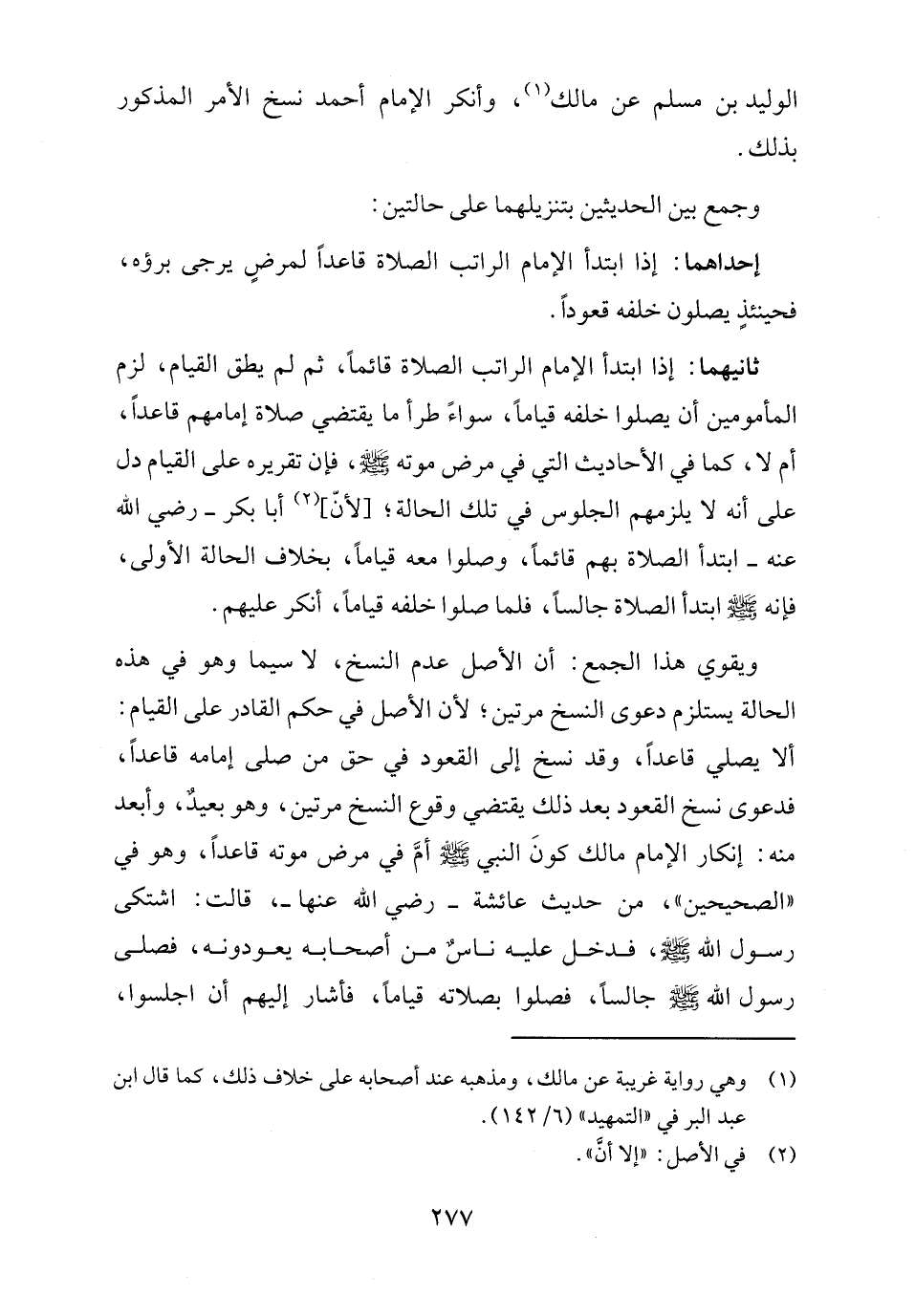 ويقوي هذا الجمع: أن الأصل عدم النسخ، لا سيما وهو في هذه الحالة يستلزم دعوى النسخ مرتين؛ لأن الأصل في حكم القادر على القيام: ألا يصلي قاعداً، وقد نسخ إلى القعود في حق من صلى إمامه قاعداً، فدعوى نسخ القعود بعد ذلك يقتضي وقوع النسخ مرتين، وهو بعيدٌ، وأبعد منه: إنكار الإمام مالك كونَ النبي - صلى الله عليه وسلم - أمَّ في مرض موته قاعداً، وهو في "الصحيحين"، من حديمث عائشة - رضي الله عنها -، قالت: اشتكى رسول الله - صلى الله عليه وسلم -، فدخل عليه ناسٌ من أصحابه يعودونه، فصلى رسول الله - صلى الله عليه وسلم - جالساً، فصلوا بصلاته قياماً، فأشار إليهم أن اجلسوا،