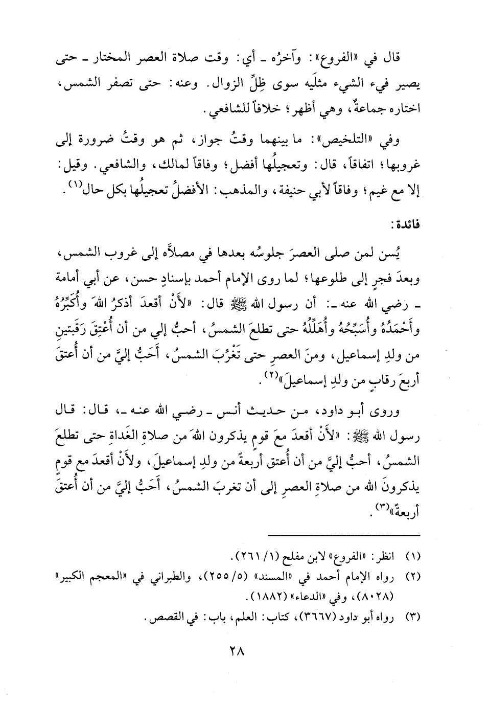 يُسن لمن صلى العصرَ جلوسُه بعدها في مصلَّاه إلى غروب الشمس، وبعدَ فجرٍ إلى طلوعها؛ لما روى الإمام أحمد بإسنادٍ حسن، عن أبي أمامة - رضي الله عنه -: أن رسول الله - صلى الله عليه وسلم - قال: "لأَنْ أقعدَ أذكرُ اللهَ وأُكَبِّرُهُ وأَحْمَدُهُ وأُسَبِّحُهُ وأُهَلِّلُهُ حتى تطلعَ الشمسُ، أحبُّ إلي من أن أُعْتِقَ رَقَبتينِ من ولدِ إسماعيل، ومنَ العصرِ حتى تَغْرُبَ الشمسُ، أَحَبُّ إليَّ من أن أُعتقَ أربعَ رقابٍ من ولدِ إسماعيلَ" (٢).