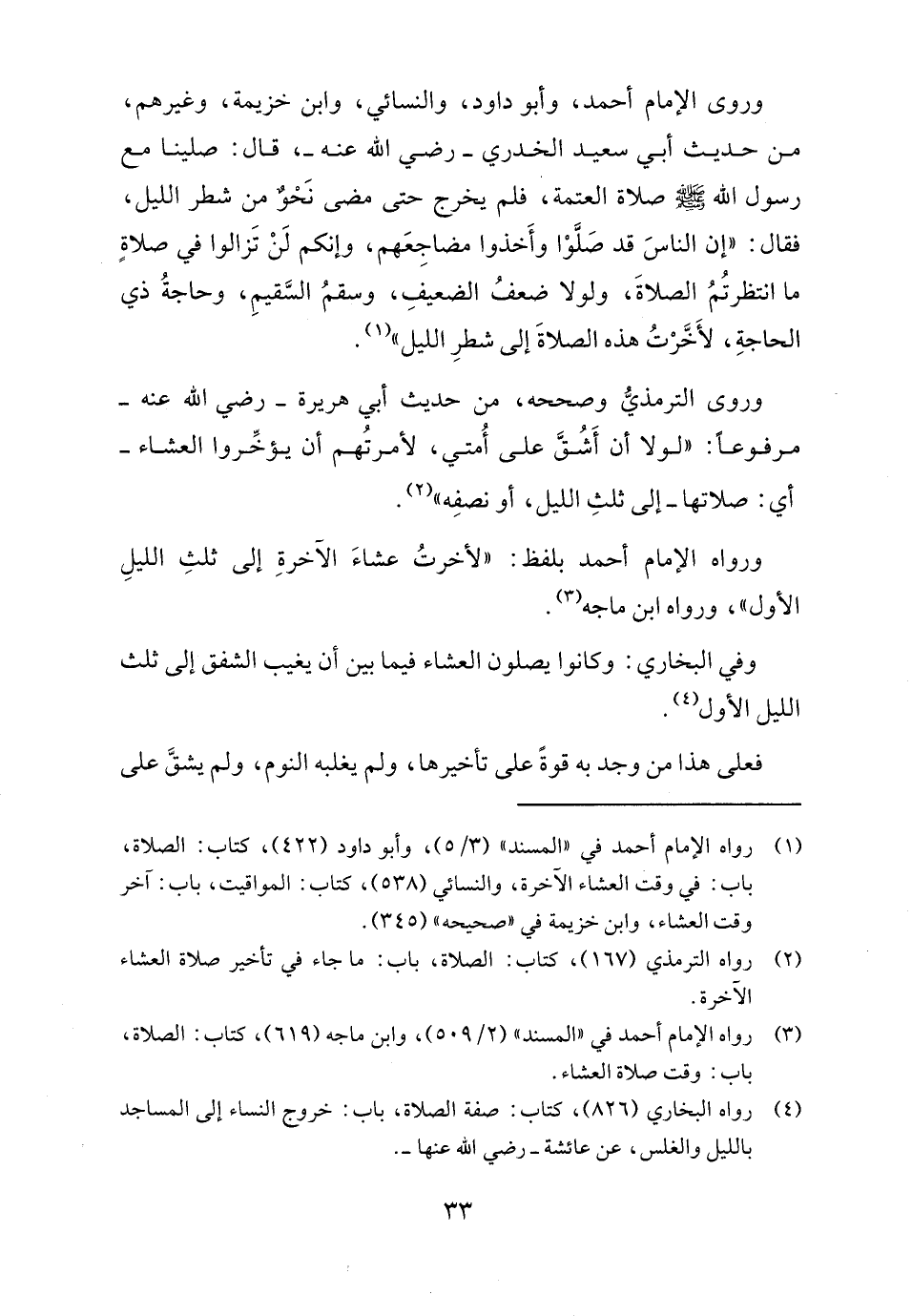 (٣) رواه الإمام أحمد في "المسند" (٢/ ٥٠٩)، وابن ماجه (٦١٩)، كتاب: الصلاة، باب: وقت صلاة العشاء.