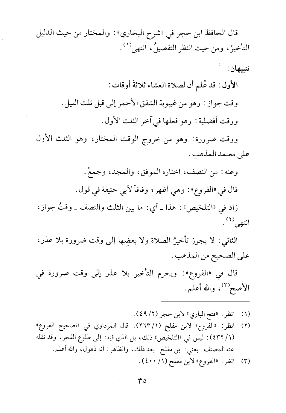 (٢) انظر: "الفروع" لابن مفلح (١/ ٢٦٣). قال المرداوي في "تصحيح الفروع" (١/ ٤٣٢): ليس في "التلخيص" ذلك، بل الذي فيه: إلى طلوع الفجر، وقد نقله عنه المصنف -يعني: ابن مفلح- بعد ذلك، والظاهر: أنه ذهول، والله أعلم.