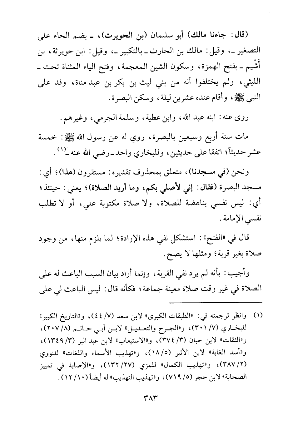 (قال: جاءنا مالك) أبو سليمان (بن الحويرث)،-بضم الحاء على التصغير-، وقيل: مالك بن الحارث -بالتكبير-، وقيل: ابن حويرثة، بن أَشْيم -بفتح الهمزة، وسكون الشين المعجمة، وفتح الياء المثناة تحت- الليثي، ولم يختلفوا أنه من بني ليث بن بكربن عبدمناة، وفد على النبي - صلى الله عليه وسلم -، وأقام عنده عشرين ليلة، وسكن البصرة.
