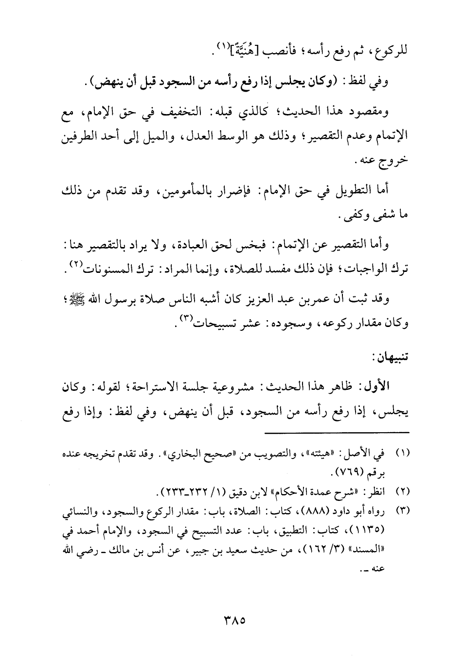 وقد ثبت أن عمر بن عبد العزيز كان أشبه الناس صلاة برسول الله - صلى الله عليه وسلم -؛ وكان مقدار ركوعه، وسجوده: عشر تسبيحات (٣).