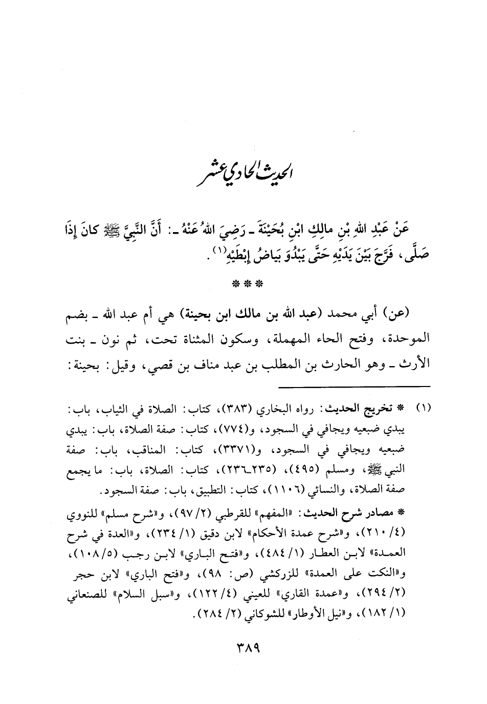 عَنْ عَبْدِ اللهِ بْنِ مالِكِ ابْنِ بُحَيْنَهَ - رَضِيَ اللهُ عَنْهُ -: أَنَّ النَّبِيَّ - صلى الله عليه وسلم - كانَ إِذَا صَلَّى، فَرَّجَ بَيْنَ يَدَيْهِ حَتَّى يَبْدُوَ بَياضُ إِبْطَيْهِ (١).