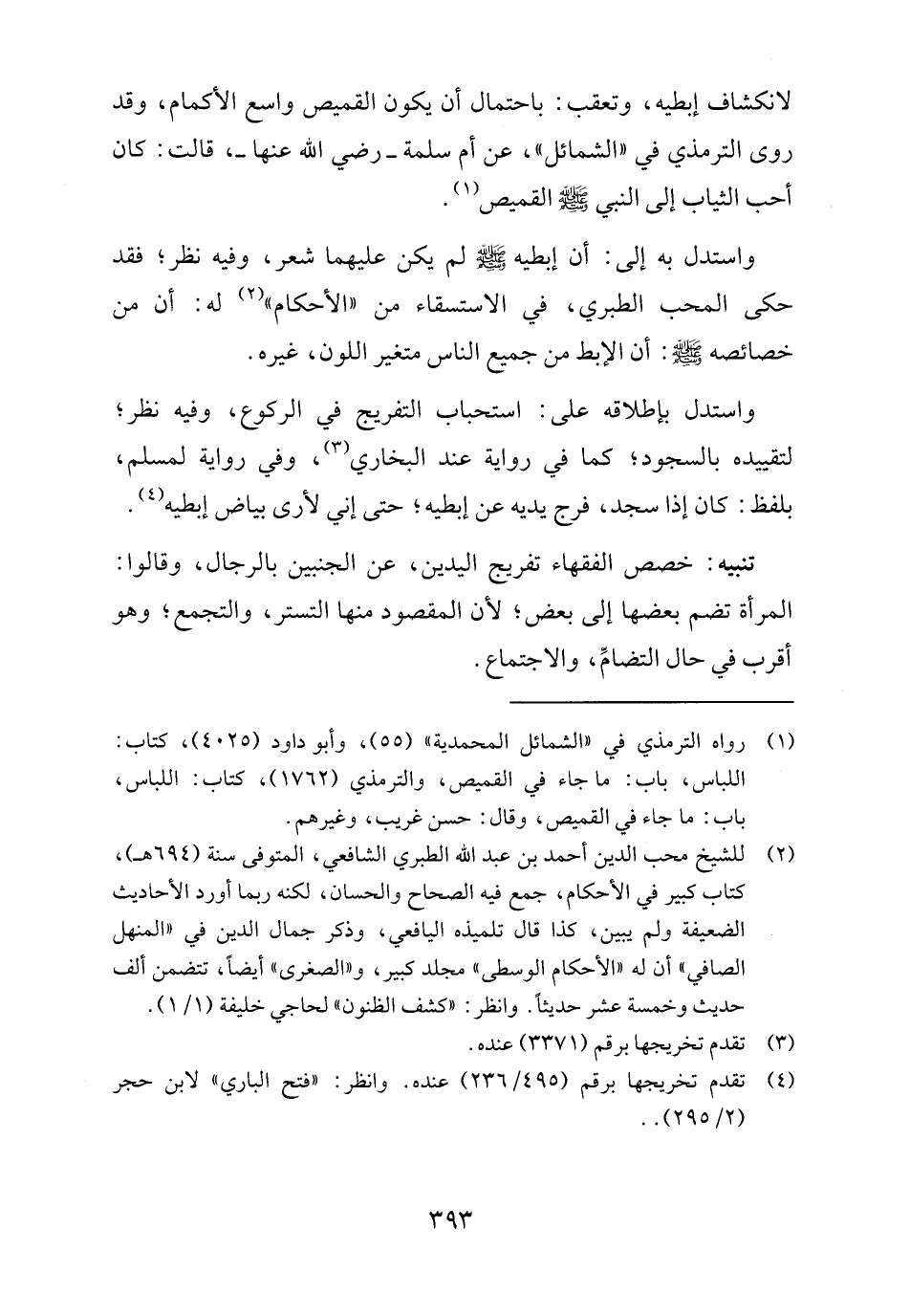 لانكشاف إبطيه، وتعقب: باحتمال أن يكون القميص واسع الأكمام، وقد روى الترمذي في "الشمائل"، عن أم سلمة - رضي الله عنها -، قالت: كان أحب الثياب إلى النبي - صلى الله عليه وسلم - القميص (١).