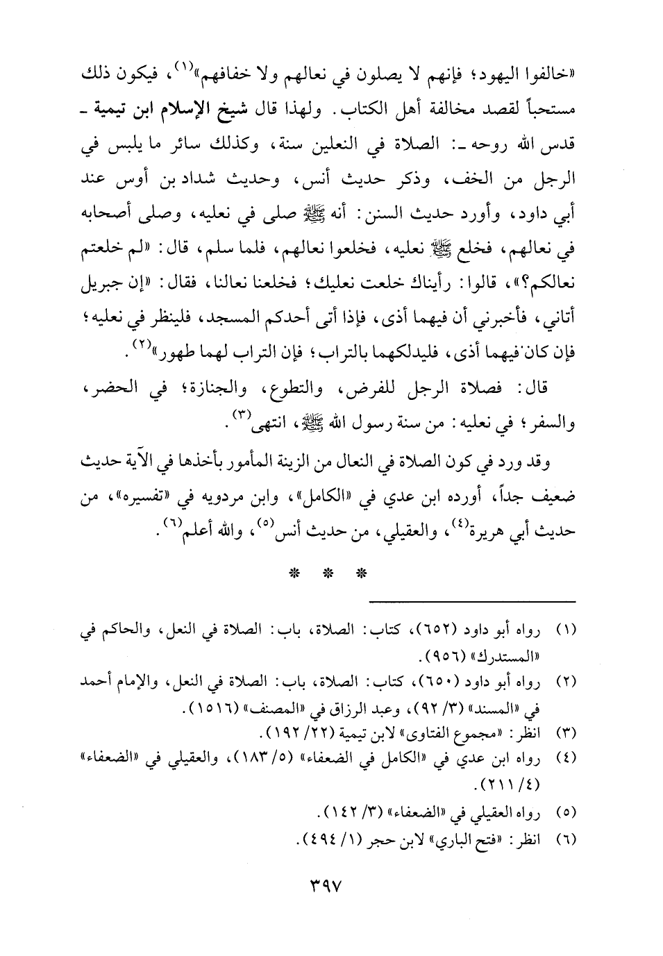 "خالفوا اليهود؛ فإنهم لا يصلون في نعالهم ولا خفافهم" (١)، فيكون ذلك مستحباً لقصد مخالفة أهل الكتاب. ولهذا قال شيخ الإسلام ابن تيمية - قدس الله روحه-: الصلاة في النعلين سنة، وكذلك سائر ما يلبس في الرجل من الخف، وذكر حديث أنس، وحديث شداد بن أوس عند أبي داود، وأورد حديث السنن: أنه - صلى الله عليه وسلم - صلى في نعليه، وصلى أصحابه في نعالهم، فخلع - صلى الله عليه وسلم - نعليه، فخلعوا نعالهم، فلما سلم، قال: "لم خلعتم نعالكم؟ "، قالوا: رأيناك خلعت نعليك؛ فخلعنا نعالنا، فقال: "إن جبريل أتاني، فأخبرني أن فيهما أذى، فإذا أتى أحدكم المسجد، فلينظر في نعليه؛ فإن كان فيهما أذى، فليدلكهما بالتراب؛ فإن التراب لهما طهور" (٢).