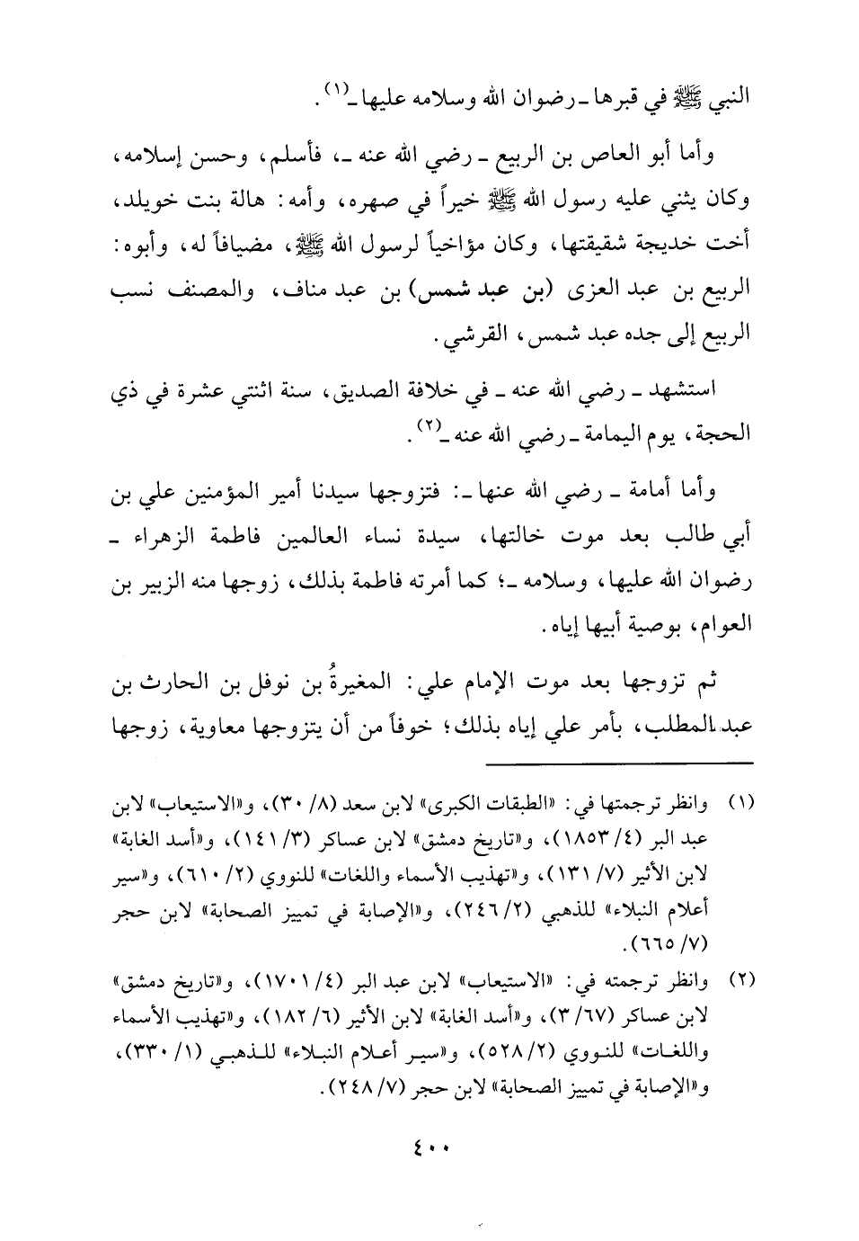 وأما أمامة - رضي الله عنها -: فتزوجها سيدنا أمير المؤمنين علي بن أبي طالب بعد موت خالتها، سيدة نساء العالمين فاطمة الزهراء - رضوان الله عليها، وسلامه-؛ كما أمرته فاطمة بذلك، زوجها منه الزبير بن العوام، بوصية أبيها إياه.