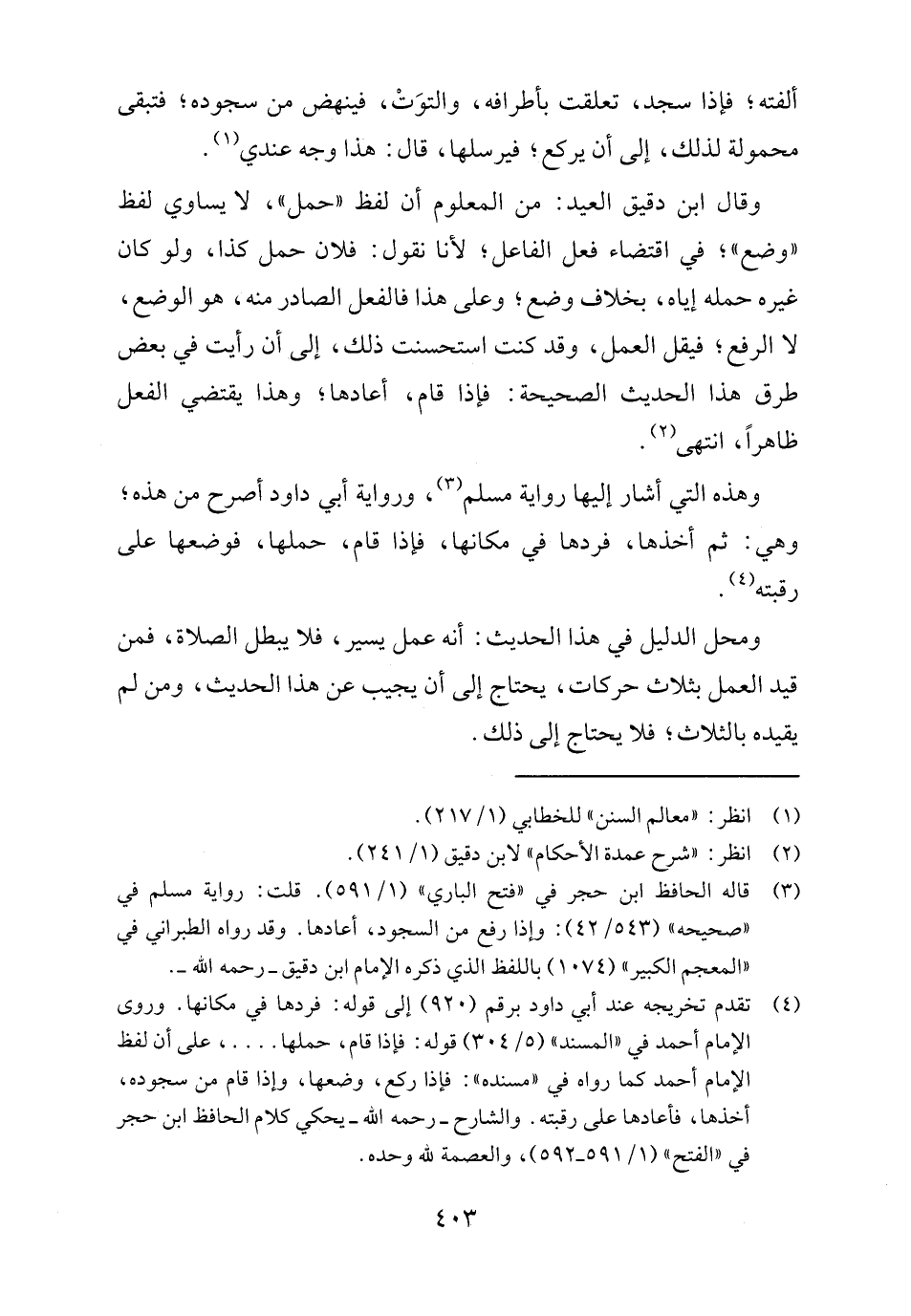 (٣) قاله الحافظ ابن حجر في "فتح الباري" (١/ ٥٩١). قلت: رواية مسلم في "صحيحه" (٥٤٣/ ٤٢): وإذا رفع من السجود، أعادها. وقد رواه الطبراني في "المعجم الكبير" (١٠٧٤) باللفظ الذي ذكره الإمام ابن دقيق -رحمه الله-.