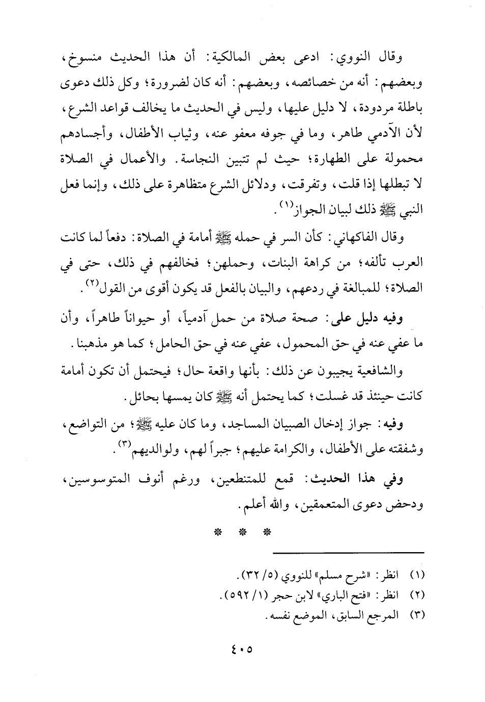 وقال النووي: ادعى بعض المالكية: أن هذا الحديث منسوخ، وبعضهم: أنه من خصائصه، وبعضهم: أنه كان لضرورة؛ وكل ذلك دعوى باطلة مردودة، لا دليل عليها، وليس في الحديث ما يخالف قواعد الشرع، لأن الآدمي طاهر، وما في جوفه معفو عنه، وثياب الأطفال، وأجسادهم محمولة على الطهارة؛ حيث لم تتبين النجاسة. والأعمال في الصلاة لا تبطلها إذا قلت، وتفرقت، ودلائل الشرع متظاهرة على ذلك، وإنما فعل النبي - صلى الله عليه وسلم - ذلك لبيان الجواز (١).