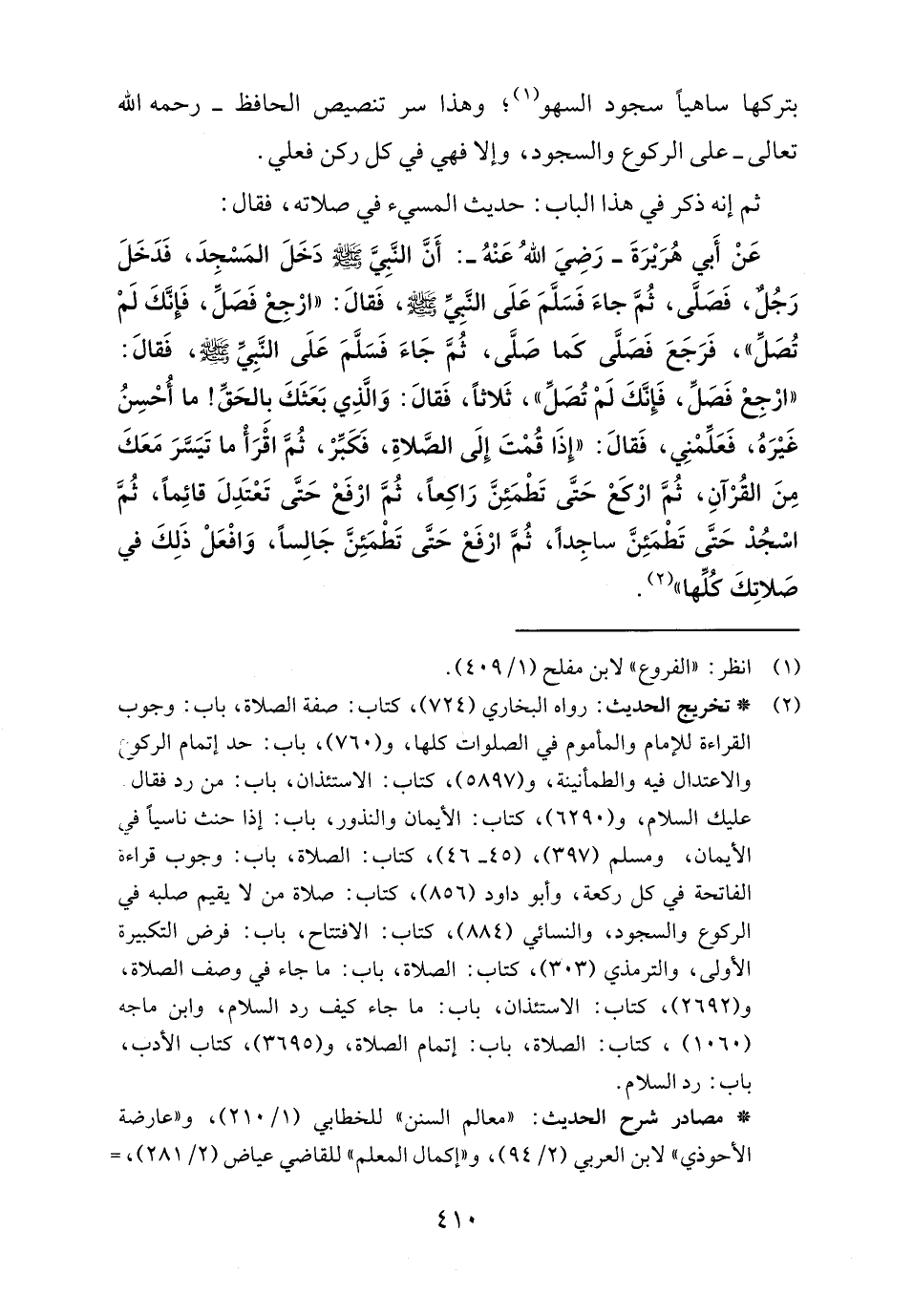 عَنْ أَبي هُرَيْرَةَ - رَضِيَ اللهُ عَنْهُ -: أَنَّ النَّبِيَّ - صلى الله عليه وسلم - دَخَلَ المَسْجِدَ، فَدَخَلَ رَجُلٌ، فَصَلَّى، ثُمَّ جاءَ فَسَلَّمَ عَلَى النَّبِيِّ - صلى الله عليه وسلم -، فَقالَ: "ارْجِعْ فَصَلِّ، فَإنَّكَ لَمْ تُصَلِّ"، فَرَجَعَ فَصَلَّى كَما صَلَّى، ثُمَّ جَاءَ فَسَلَّمَ عَلَى النَّبِيّ - صلى الله عليه وسلم -، فَقالَ: "ارْجِعْ فَصَلِّ، فَإِنَّكَ لَمْ تُصَلِّ"، ثَلاثاً، فَقالَ: وَالَّذِي بَعَثَكَ بالحَقِّ! ما أُحْسِنُ غَيْرَهُ، فَعَلِّمْنِي، فَقالَ: "إِذَا قُمْتَ إِلَى الصَّلاةِ، فَكَبِّرْ، ثُمَّ اقرَأْ ما تَيَسَّرَ مَعَكَ مِنَ القُرْآنِ، ثُمَّ ارْكَعْ حَتَّى تَطْمَئِنَّ رَاكعاً، ثُمَّ ارْفَعْ حَتَّى تَعْتَدِلَ قائِماً، ثُمَّ اسْجُدْ حَتَّى تَطْمَئِنَّ ساجِداً، ثُمَّ ارْفَعْ حَتَّى تَطْمَئِنَّ جَالِساً، وَافْعَلْ ذَلِكَ في صَلاتِكَ كُلِّها" (٢).