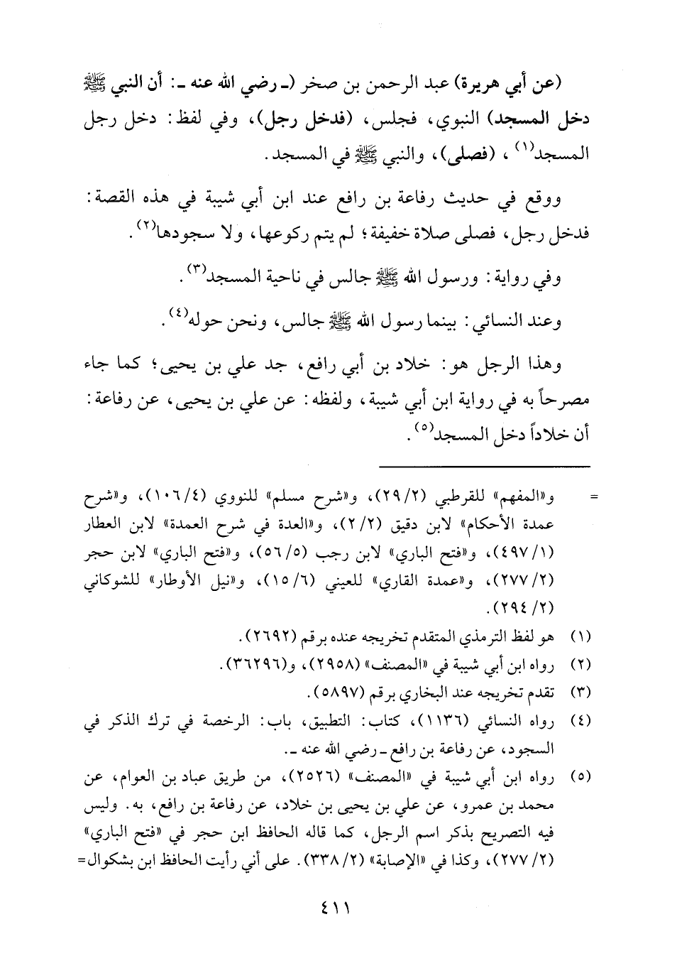 وهذا الرجل هو: خلاد بن أبي رافع، جد علي بن يحيى؛ كما جاء مصرحاً به في رواية ابن أبي شيبة، ولفظه: عن علي بن يحيى، عن رفاعة: أن خلاداً دخل المسجد (٥).