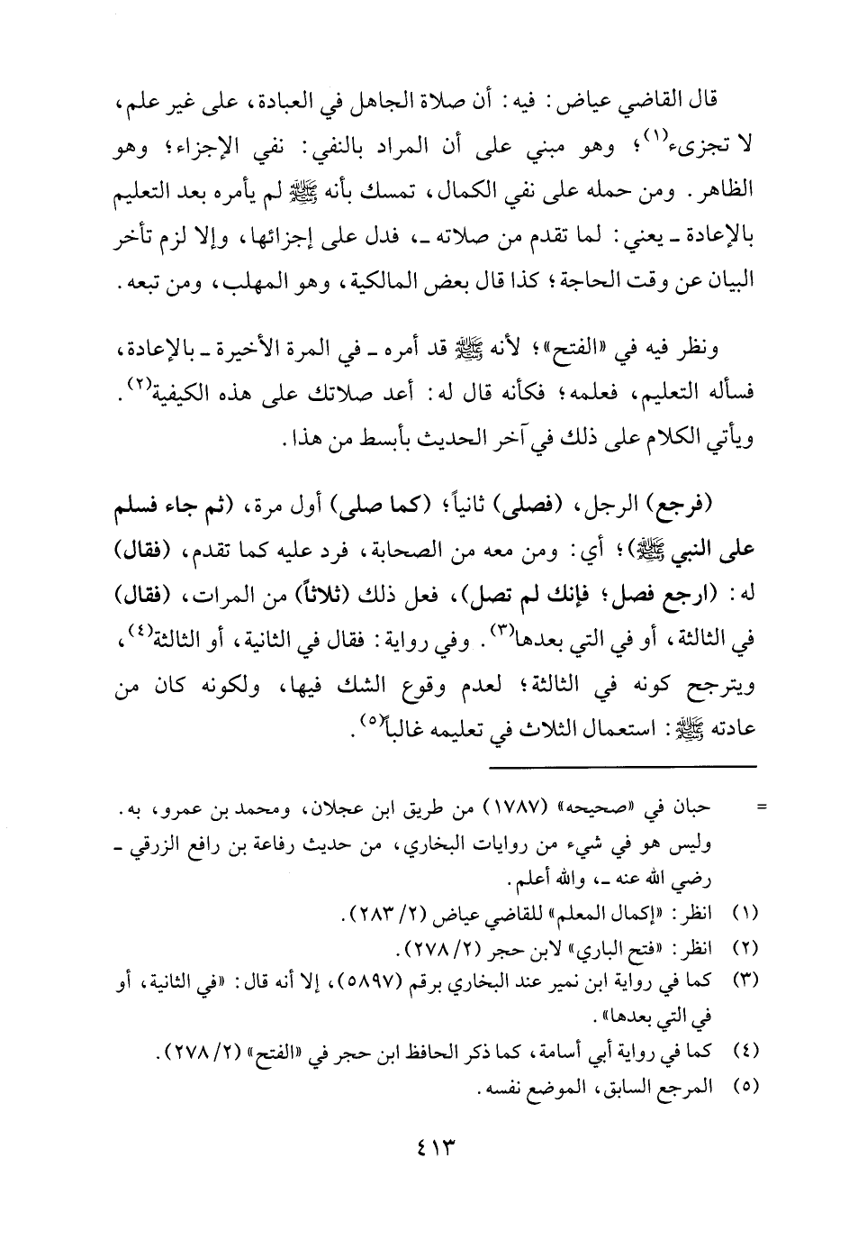 قال القاضي عياض: فيه: أن صلاة الجاهل في العبادة، على غير علم، لا تجزىء (١)؛ وهو مبني على أن المراد بالنفي: نفي الإجزاء؛ وهو الظاهر. ومن حمله على نفي الكمال، تمسك بأنه - صلى الله عليه وسلم - لم يأمره بعد التعليم بالإعادة -يعني: لما تقدم من صلاته-، فدل على إجزائها، وإلا لزم تأخر البيان عن وقت الحاجة؛ كذا قال بعض المالكية، وهو المهلب، ومن تبعه.