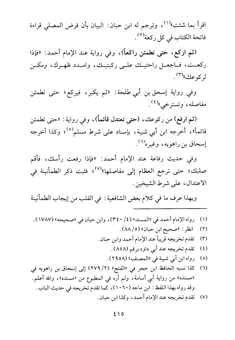وفي حديث رفاعة عند الإمام أحمد: "فإذا رفعت رأسك، فأقم صلبك؛ حتى ترجع العظام إلى مفاصلها" (٧)؛ فثبت ذكر الطمأنينة في الاعتدال، على شرط الشيخين.