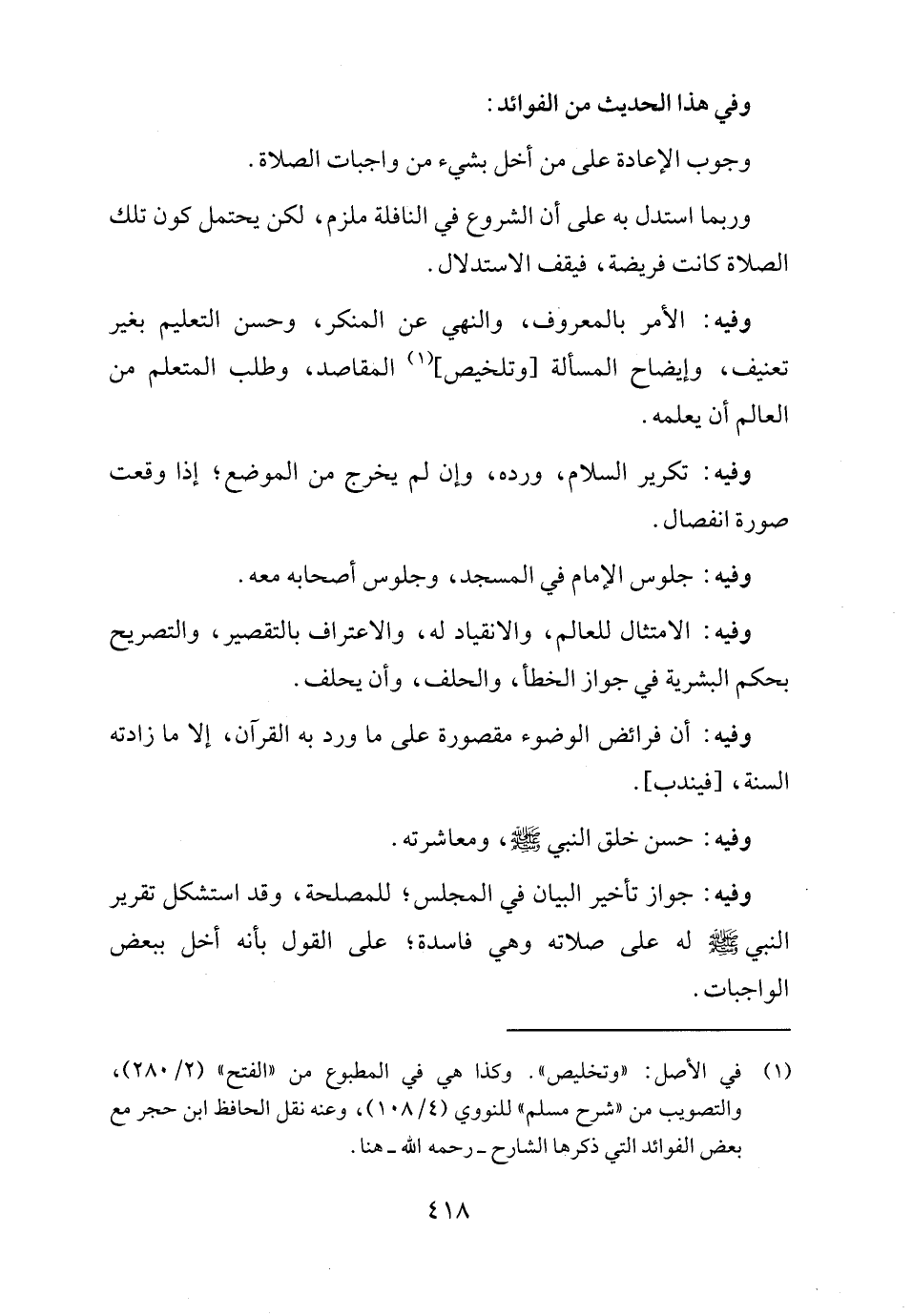 (١) في الأصل: "وتخليص". وكذا هي في المطبوع من "الفتح" (٢/ ٢٨٠)، والتصويب من "شرح مسلم" للنووي (٤/ ١٠٨)، وعنه نقل الحافظ ابن حجر مع بعض الفوائد التي ذكرها الشارح -رحمه الله- هنا.