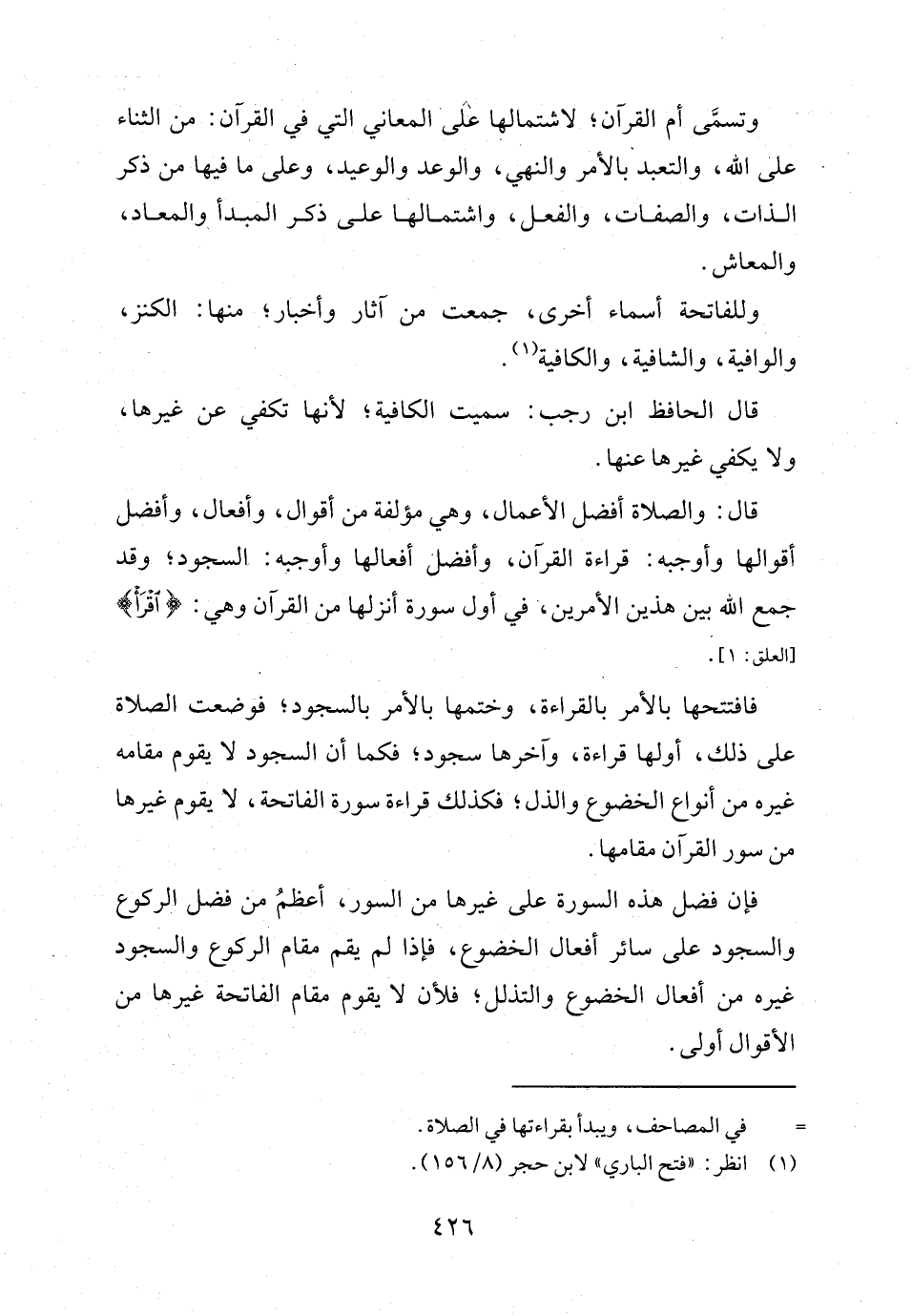 فافتتحها بالأمر بالقراءة، وختمها بالأمر بالسجود؛ فوضعت الصلاة على ذلك، أولها قراءة، وآخرها سجود؛ فكما أن السجود لا يقوم مقامه غيره من أنواع الخضوع والذل؛ فكذلك قراءة سورة الفاتحة، لا يقوم غيرها من سور القرآن مقامها.