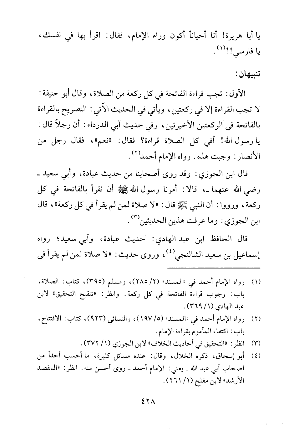 يا أبا هريرة! أنا أحياناً أكون وراء الإمام، فقال: اقرأ بها في نفسك، يا فارسي!! (١).