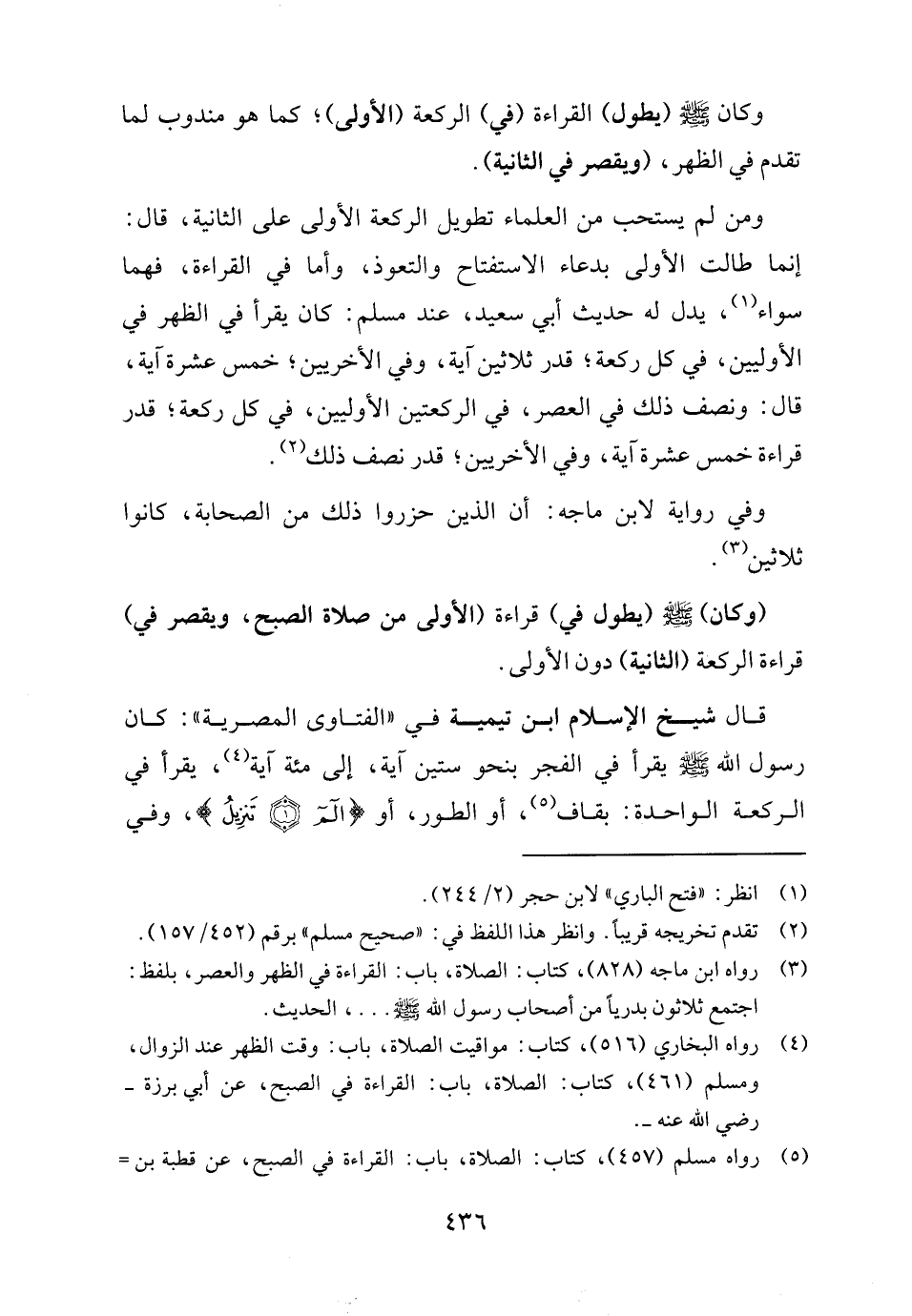 قال شيخ الإسلام ابن تيمية في "الفتاوى المصرية": كان رسول الله - صلى الله عليه وسلم - يقرأ في الفجر بنحو ستين آية، إلى مئة آية (٤)، يقرأ في الركعة الواحدة: بقاف (٥)، أو الطور، أو {الم (١) تَنْزِيلُ}، وفي