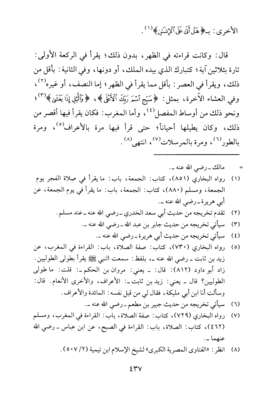 (٥) رواه البخاري (٧٣٠)، كتاب: صفة الصلاة، باب: القراءة في المغرب، عن زيد بن ثابت - رضي الله عنه -، بلفظ: سمعت النبي - صلى الله عليه وسلم - يقرأ بطولى الطوليين. زاد أبو داود (٨١٢): قال: -يعني: مروان بن الحكم-: قلت: ما طولى الطوليين؟ قال -يعني: زيد بن ثابت-: الأعراف، والأخرى الأنعام. قال: وسألت أنا ابن أبي مليكة، فقال لي من قبل نفسه: المائدة والأعراف.