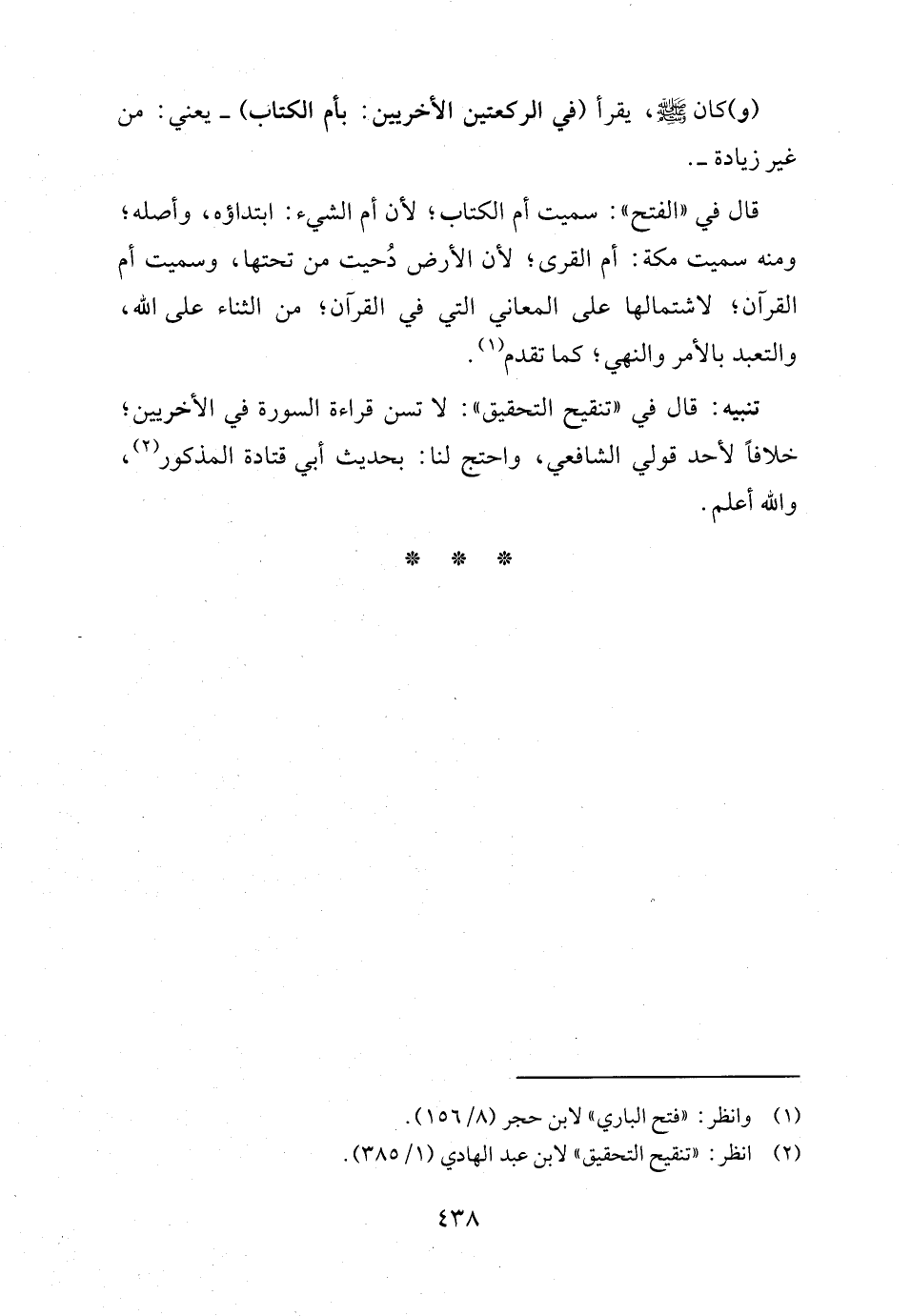 تنبيه: قال في "تنقيح التحقيق": لا تسن قراءة السورة في الأخريين؛ خلافاً لأحد قولي الشافعي، واحتج لنا: بحديث أبي قتادة المذكور (٢)، والله أعلم.
