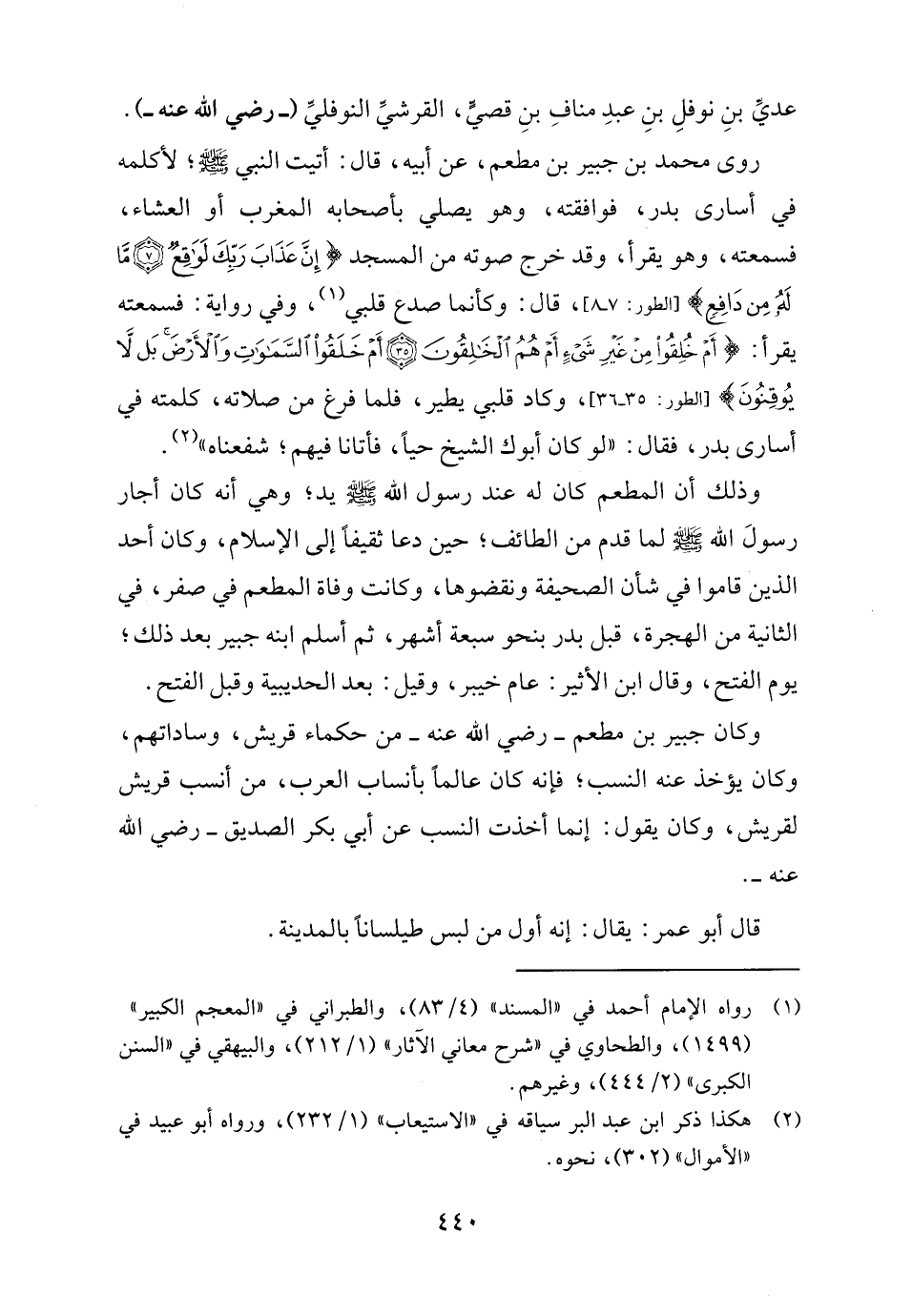 عديِّ بنِ نوفلِ بنِ عبدِ منافِ بنِ قصيٍّ، القرشيِّ النوفليِّ (- رضي الله عنه -). روى محمد بن جبير بن مطعم، عن أبيه، قال: أتيت النبي - صلى الله عليه وسلم -، لأكلمه في أسارى بدر، فوافقته، وهو يصلي بأصحابه المغرب أو العشاء، فسمعته، وهو يقرأ، وقد خرج صوته من المسجد {إِنَّ عَذَابَ رَبِّكَ لَوَاقِعٌ (٧) مَا لَهُ مِنْ دَافِعٍ} [الطور: ٧ - ٨]، قال: وكأنما صدع قلبي (١)، وفي رواية: فسمعته يقرأ: {أَمْ خُلِقُوا مِنْ غَيْرِ شَيْءٍ أَمْ هُمُ الْخَالِقُونَ (٣٥) أَمْ خَلَقُوا السَّمَاوَاتِ وَالْأَرْضَ بَلْ لَا يُوقِنُونَ} [الطور: ٣٥ - ٣٦]، وكاد قلبي يطير، فلما فرغ من صلاته، كلمته في أسارى بدر، فقال: "لو كان أبوك الشيخ حياً، فأتانا فيهم؛ شفعناه" (٢).
