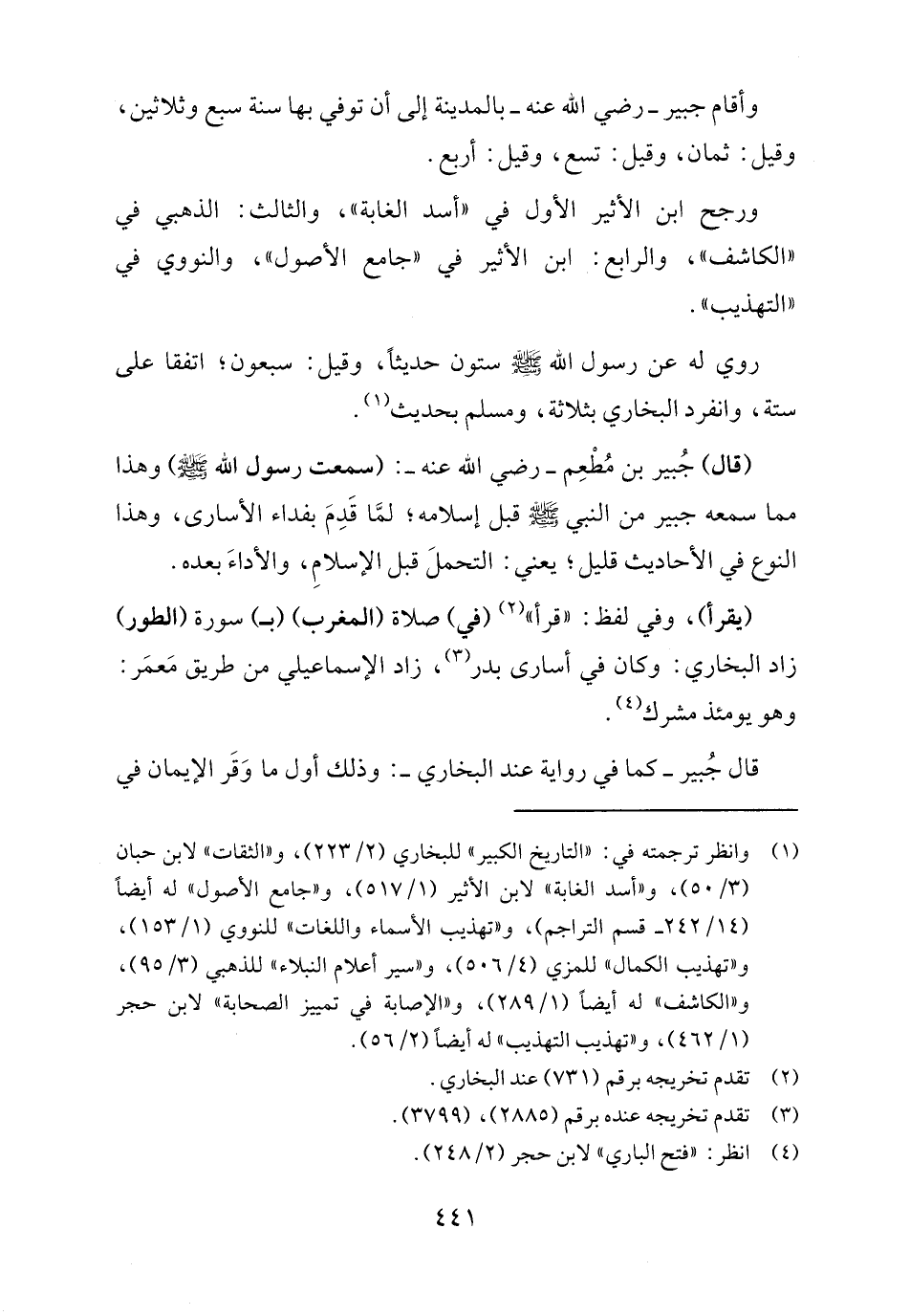 وأقام جبير - رضي الله عنه - بالمدينة إلى أن توفي بها سنة سبع وثلاثين، وقيل: ثمان، وقيل: تسع، وقيل: أربع.