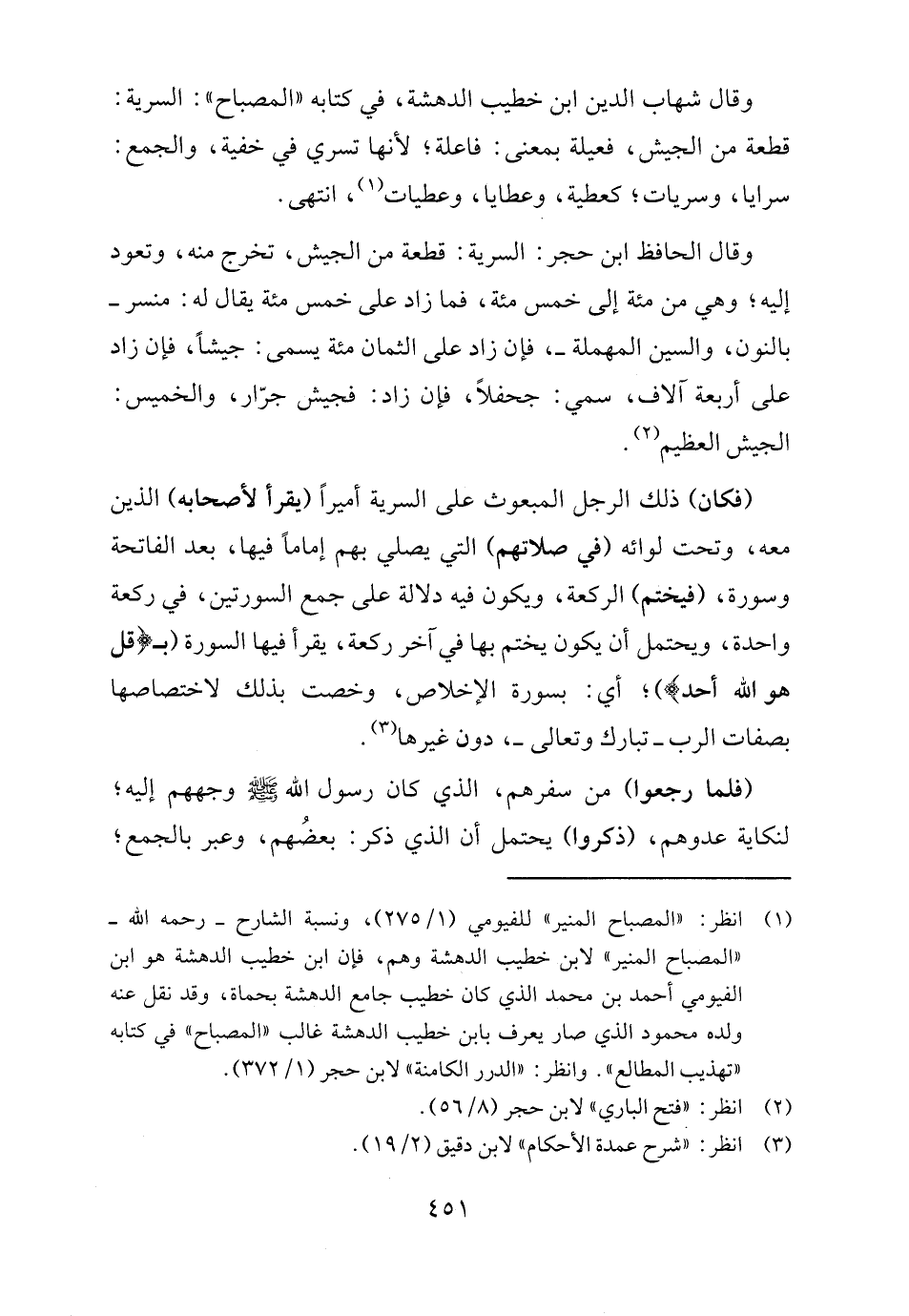 وقال الحافظ ابن حجر: السرية: قطعة من الجيش، تخرج منه، وتعود إليه؛ وهي من مئة إلى خمس مئة، فما زاد على خمس مئة يقال له: منسر -بالنون، والسين المهملة-، فإن زاد على الثمان مئة يسمى: جيشًا، فإن زاد على أربعة آلاف، سمي: جحفلًا، فإن زاد: فجيش جرّار، والخميس: الجيش العظيم (٢).