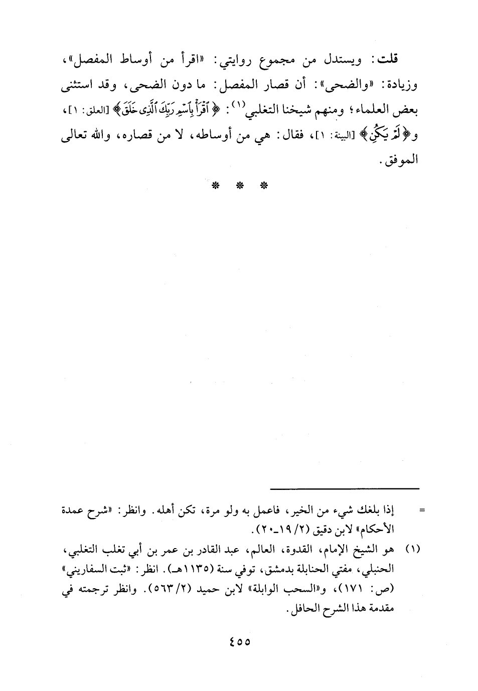 (١) هو الشيخ الإمام، القدوة، العالم، عبد القادر بن عمر بن أبي تغلب التغلبي، الحنبلي، مفتي الحنابلة بدمشق، توفي سنة (١١٣٥ هـ). انظر: "ثبت السفاريني" (ص: ١٧١)، و"السحب الوابلة" لابن حميد (٢/ ٥٦٣). وانظر ترجمته في مقدمة هذا الشرح الحافل.