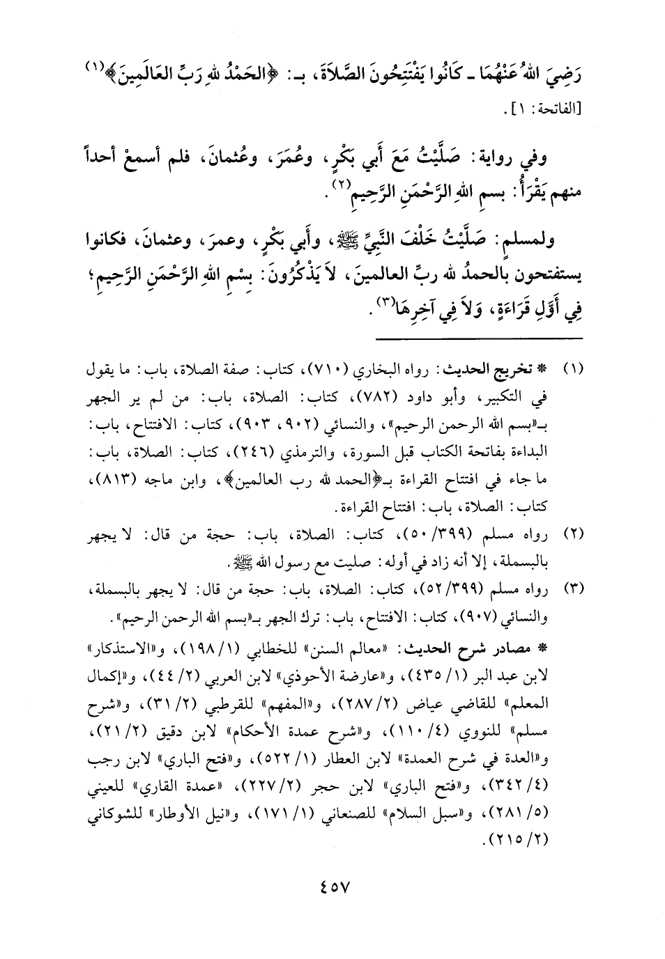 (٣) رواه مسلم (٣٩٩/ ٥٢)، كتاب: الصلاة، باب: حجة من قال: لا يجهر بالبسملة، والنسائي (٩٠٧)، كتاب: الافتتاح، باب: ترك الجهر بـ "بِسْمِ اللَّهِ الرَّحْمَنِ الرَّحِيمِ".