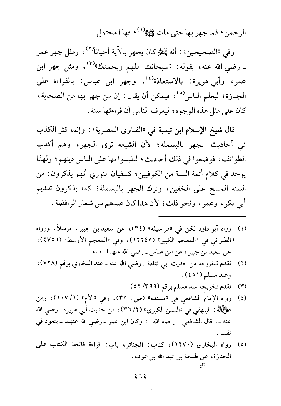 (٥) رواه البخاري (١٢٧٠)، كتاب: الجنائز، باب: قراءة فاتحة الكتاب على الجنازة، عن طلحة بن عبد اللَّه بن عوف.