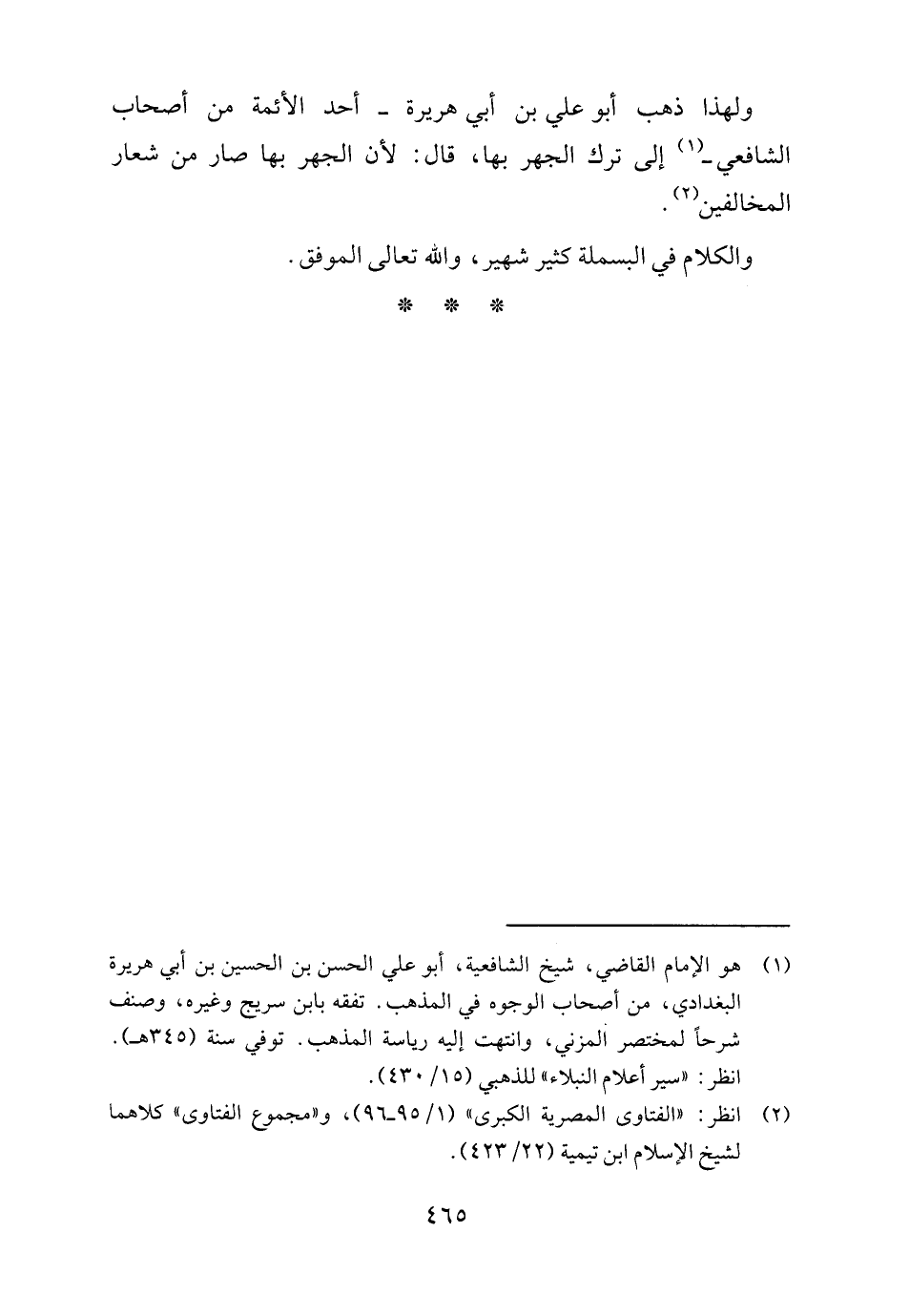 ولهذا ذهب أبو علي بن أبي هريرة -أحد الأئمة من أصحاب الشافعي (١) إلى ترك الجهر بها، قال: لأن الجهر بها صار من شعار المخالفين (٢).