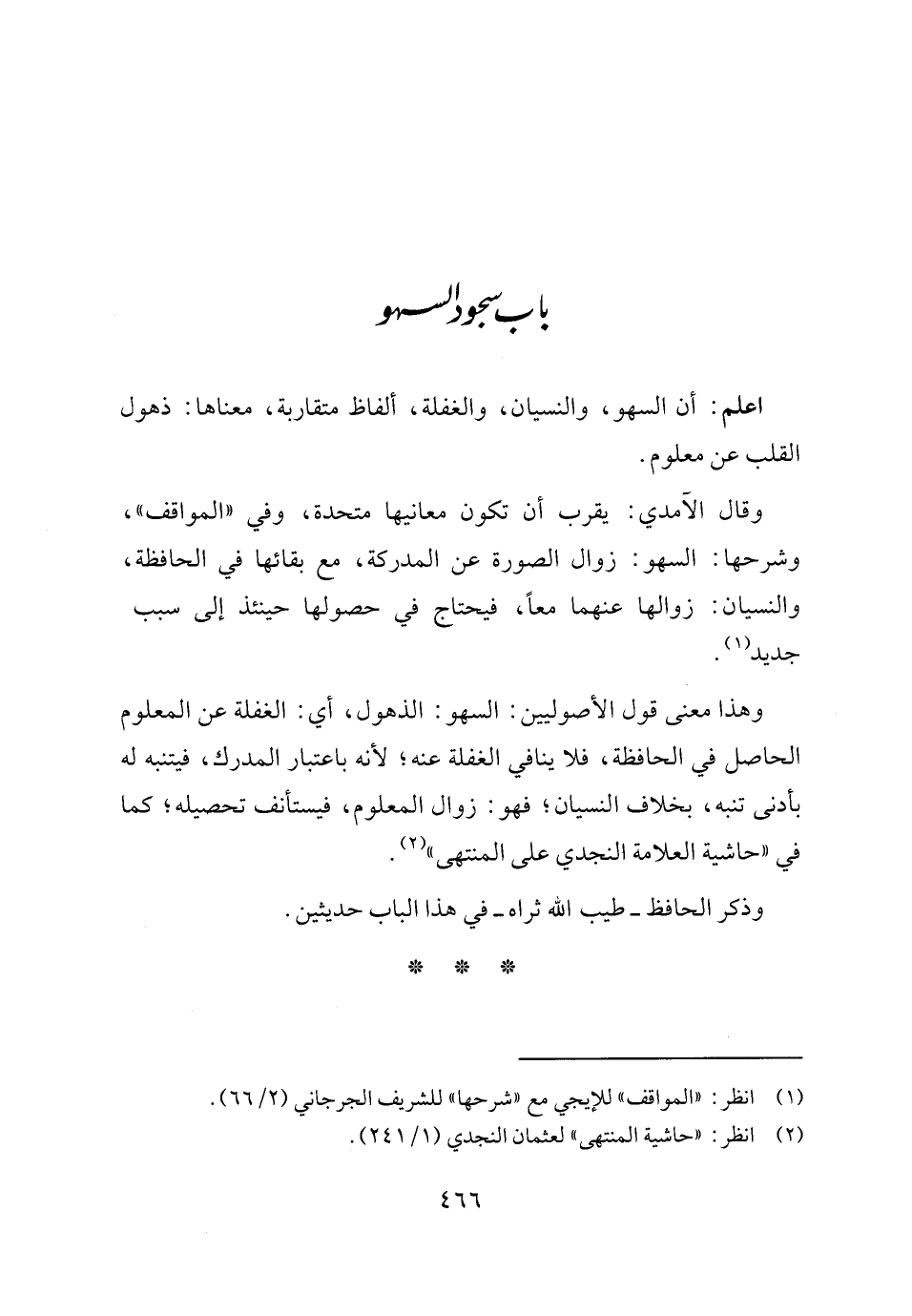 وهذا معنى قول الأصوليين: السهو: الذهول، أي: الغفلة عن المعلوم الحاصل في الحافظة، فلا ينافي الغفلة عنه؛ لأنه باعتبار المدرك، فيتنبه له بأدنى تنبه، بخلاف النسيان؛ فهو: زوال المعلوم، فيستأنف تحصيله؛ كما في "حاشية العلامة النجدي على المنتهى" (٢).
