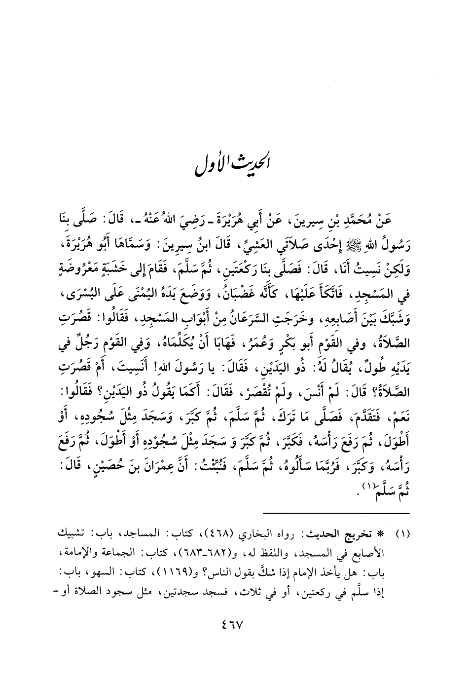 عَنْ مُحَمَّدِ بْنِ سِيرينَ، عَنْ أَبِي هُرَيْرَةَ -رَضِيَ اللَّهُ عَنْهُ-، قَالَ: صَلَّى بِنَا رَسُولُ اللَّهِ -صلى اللَّه عليه وسلم- إِحْدَى صَلَاتَي العَشِيِّ، قَالَ ابنُ سِيرِينَ: وَسَمَّاهَا أَبُو هُرَيْرَةَ، وَلَكِنْ نَسِيتُ أَنَا، قَالَ: فَصَلَّى بنَا رَكْعَتَينِ، ثُمَّ سَلَّمَ، فَقَامَ إِلى خَشَبةٍ مَعْرُوضَةٍ في المَسْجِدِ، فَاتَّكَأَ عَلَيْهَا، كَأَنَّه غَضْبَانُ، وَوَضَعَ يَدَه اليُمْنَى عَلَى اليُسْرَى، وَشَبَّكَ بَيْنَ أَصَابعِهِ، وخَرَجَتِ السَّرَعَانُ مِنْ أَبْوَابِ المَسْجِدِ، فَقَالُوا: قَصُرَتِ الصَّلَاةُ، وفي القَوْمِ أَبو بَكْرٍ وَعُمَرُ، فَهَابَا أَنْ يُكَلِّمَاهُ، وَفِي القَوْم رَجُلٌ في يَدَيْهِ طُولٌ، يُقَالُ لَهُ: ذُو اليَدَيْنِ، فَقَالَ: يا رَسُولَ اللَّهِ! أَنَسِيتَ، أَمْ قَصُرَتِ الصَّلَاةُ؟ قَالَ: لَمْ أَنْسَ، ولَمْ تُقْصَرْ، فَقَالَ: أَكَمَا يَقُولُ ذُو اليَدَيْنِ؟ فَقَالُوا: نَعَمْ، فَتَقَدَّمَ، فَصَلَّى مَا تَرَكَ، ثُمَّ سَلَّمَ، ثُمَّ كبَّرَ، وَسَجَدَ مِثْلَ سُجُودِهِ، أَوْ أَطْوَلَ، ثُمَ رَفَعَ رَأْسَهُ، فَكَبَّرَ، ثُمَّ كبَّرَ وَسَجَدَ مِثْلَ سُجُوْدِهِ أَوْ أَطْوَلَ، ثُمَّ رَفَعَ رَأْسَهُ، وَكبَّرَ، فَرُبَّمَا سَأَلُوهُ، ثُمَّ سَلَّمَ، فَنُبِّئْتُ: أَنَّ عِمْرَانَ بنَ حُصَيْنٍ، قَالَ: ثُمَّ سَلَّم (١).