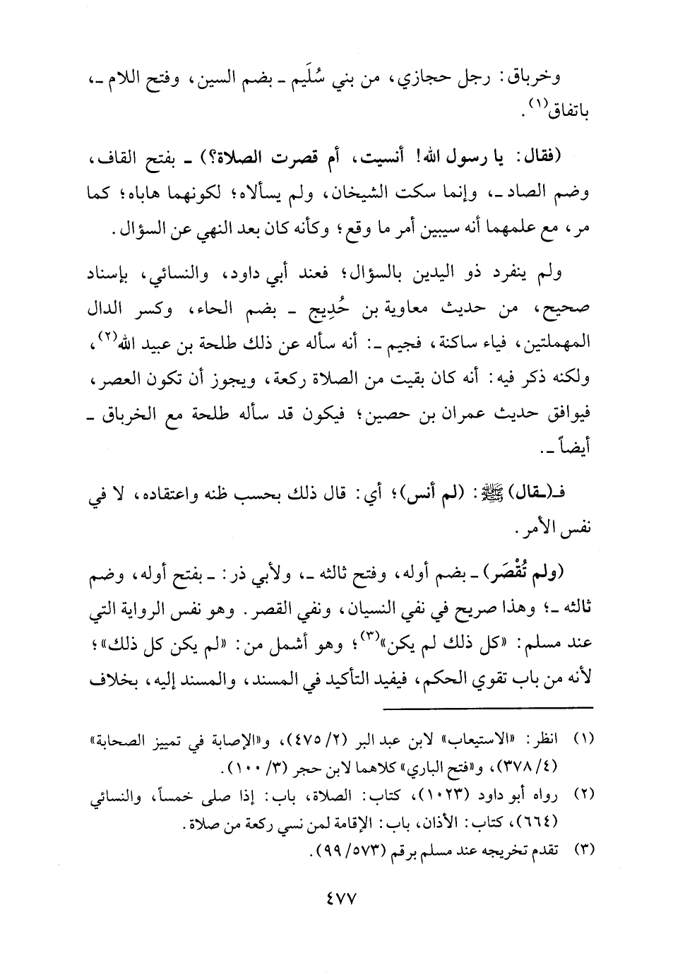 ولم ينفرد ذو اليدين بالسؤال؛ فعند أبي داود، والنسائي، بإسناد صحيح، من حديث معاوية بن حُدِيج -بضم الحاء، وكسر الدال المهملتين، فياء ساكنة، فجيم-: أنه سأله عن ذلك طلحة بن عبيد اللَّه (٢)، ولكنه ذكر فيه: أنه كان بقيت من الصلاة ركعة، ويجوز أن تكون العصر، فيوافق حديث عمران بن حصين؛ فيكون قد سأله طلحة مع الخرباق -أيضًا-.