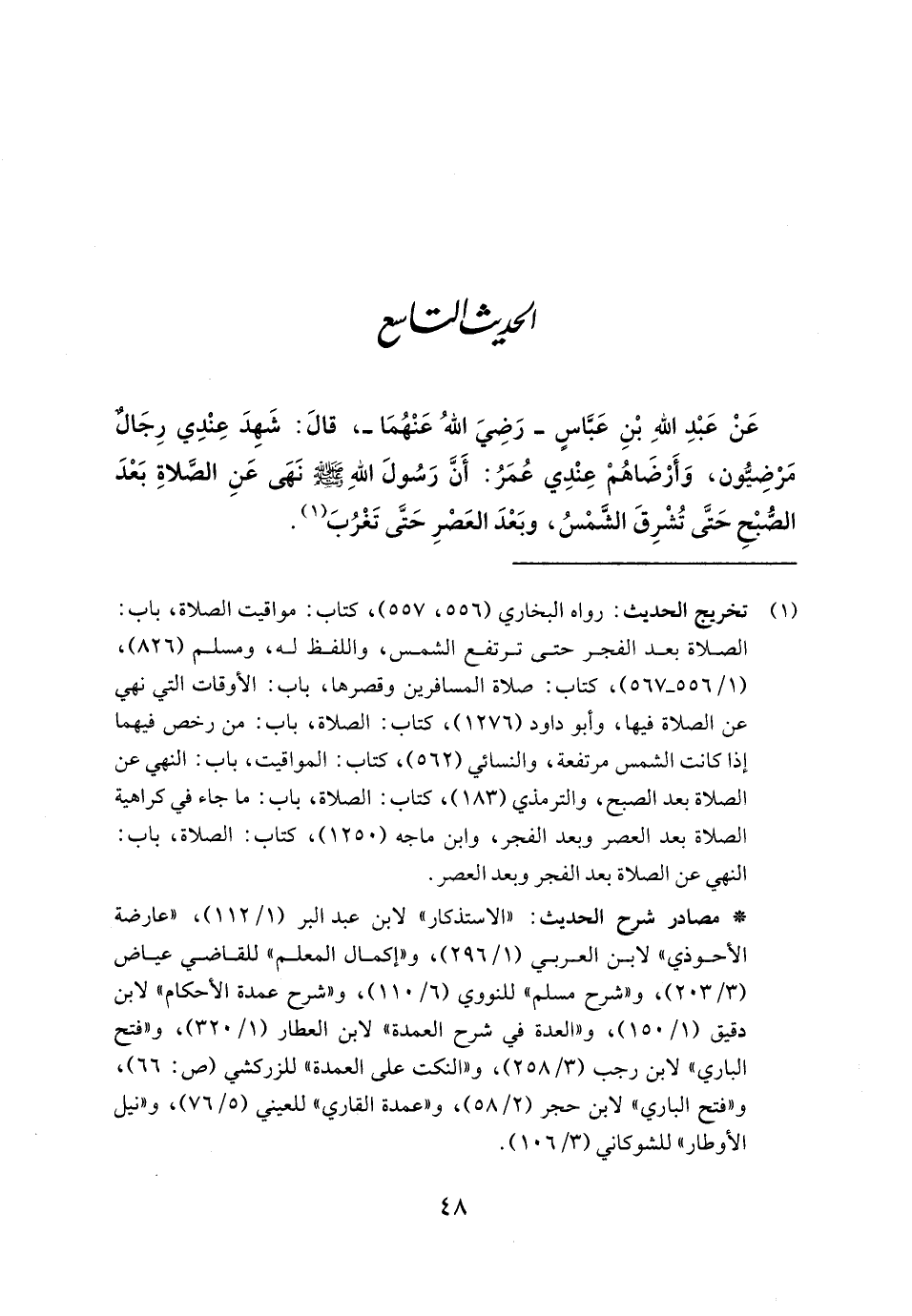 عَنْ عَبْدِ اللهِ بْنِ عَبَّاسٍ - رَضِيَ اللهُ عَنْهُمَا -، قالَ: شَهِدَ عِنْدِي رِجَالٌ مَرْضِيُّون، وَأَرْضَاهُمْ عِنْدِي عُمَرُ: أَنَّ رَسُولَ اللهِ - صلى الله عليه وسلم - نَهَى عَنِ الصَّلاةِ بَعْدَ الصُّبْحِ حَتَّى تُشْرِقَ الشَّمْسُ، وبَعْدَ العَصْرِ حَتَّى تَغرُبَ (١).