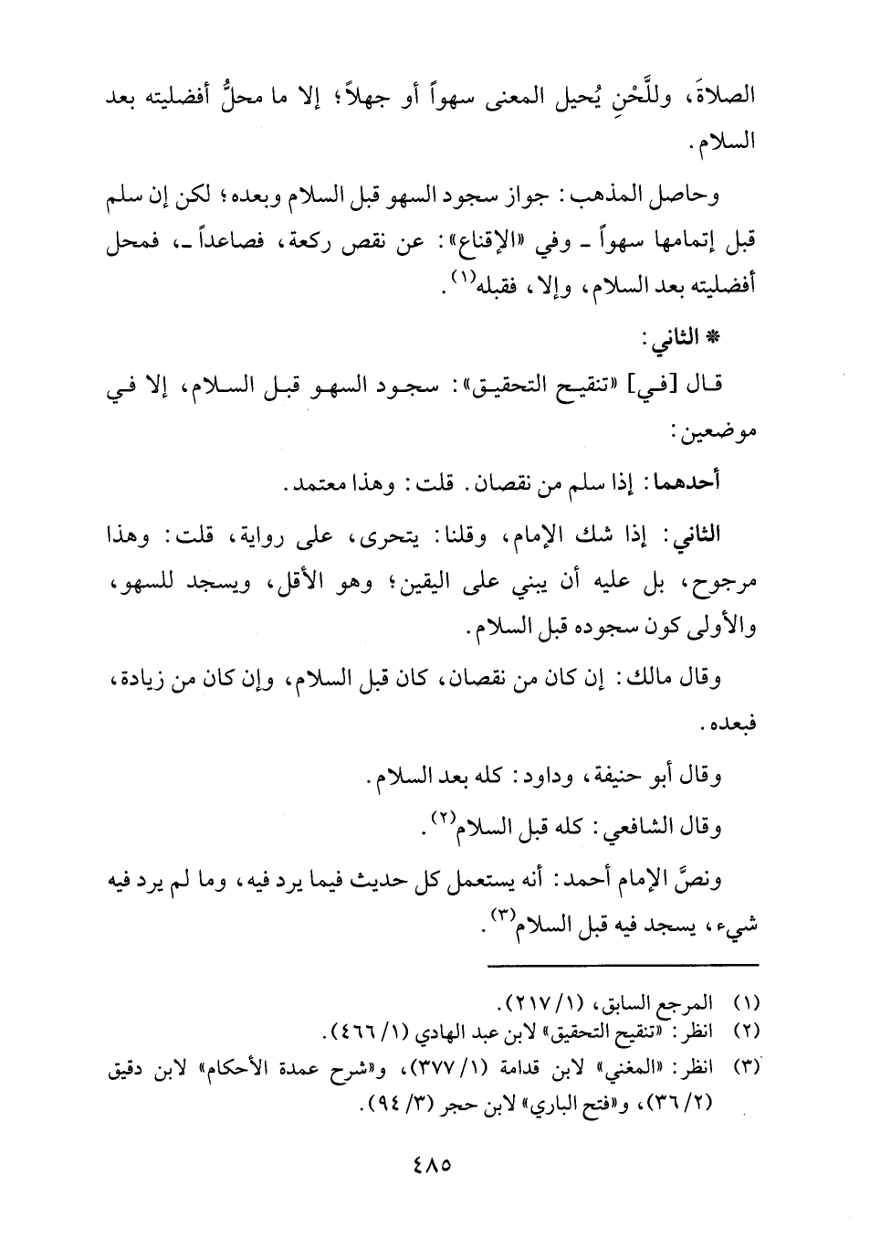 قال [في] "تنقيح التحقيق": سجود السهو قبل السلام، إلا في موضعين: