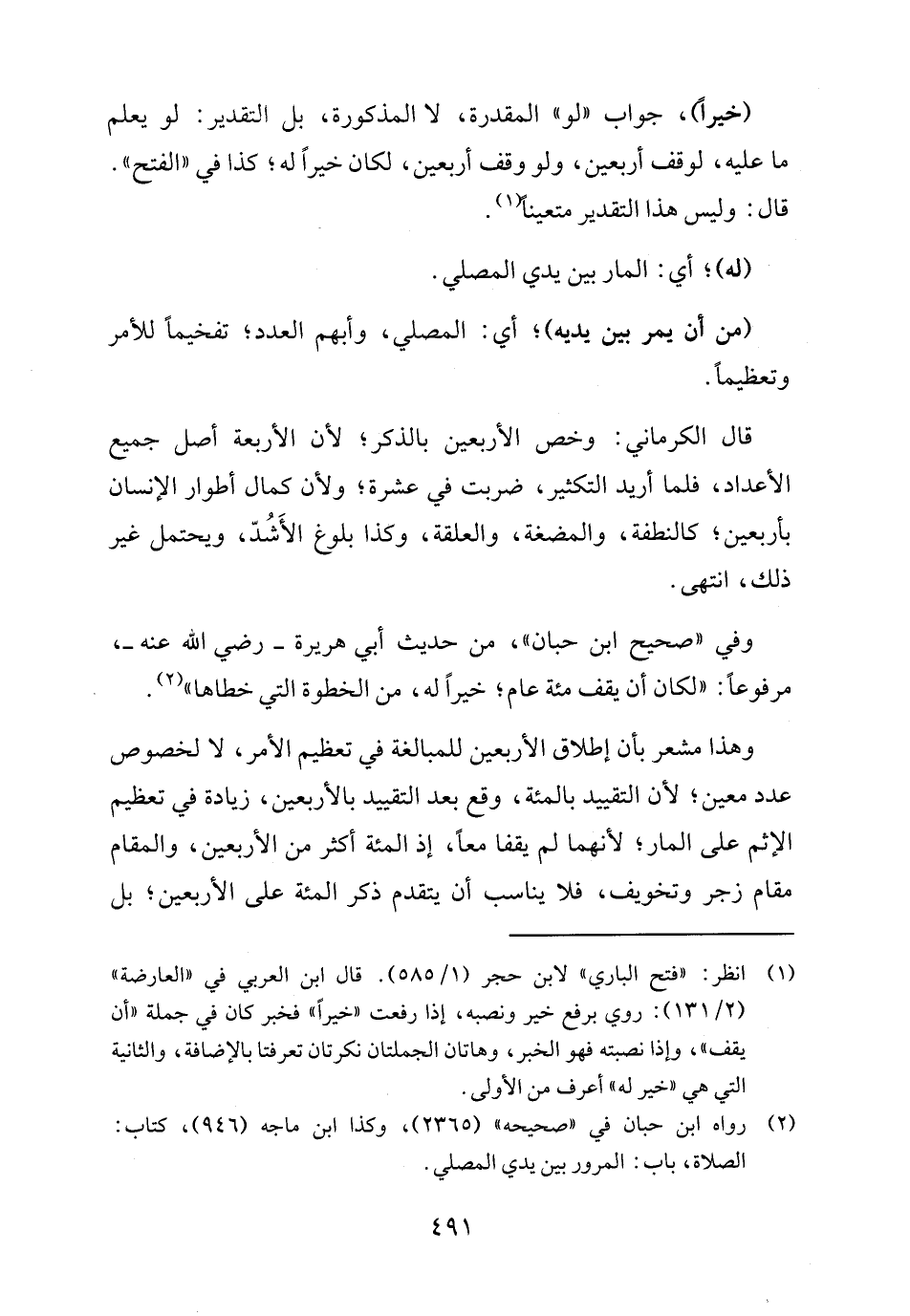 وهذا مشعر بأن إطلاق الأربعين للمبالغة في تعظيم الأمر، لا لخصوص عدد معين؛ لأن التقييد بالمئة، وقع بعد التقييد بالأربعين، زيادة في تعظيم الإثم على المار؛ لأنهما لم يقفا معًا، إذ المئة أكثر من الأربعين، والمقام مقام زجر وتخويف، فلا يناسب أن يتقدم ذكر المئة على الأربعين؛ بل