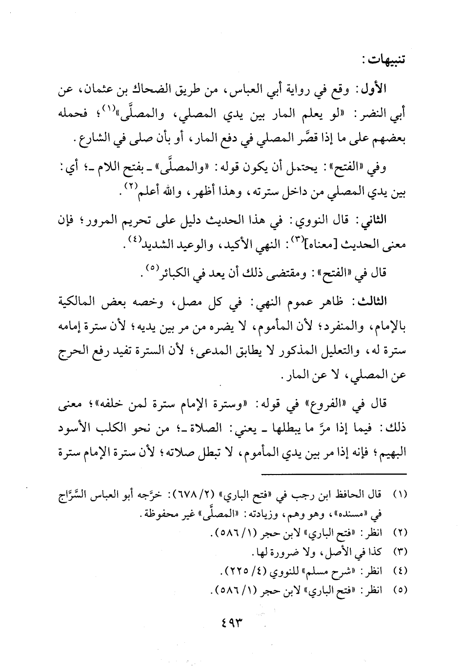 الثاني: قال النووي: في هذا الحديث دليل على تحريم المرور؛ فإن معنى الحديث [معناه] (٣): النهي الأكيد، والوعيد الشديد (٤).