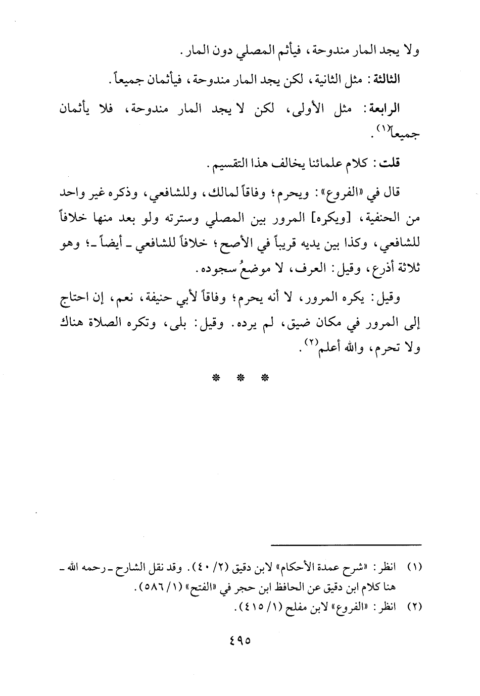 قال في "الفروع": ويحرم؛ وفاقًا لمالك، وللشافعي، وذكره غير واحد من الحنفية، [ويكره] المرور بين المصلي وسترته ولو بعد منها خلافًا للشافعي، وكذا بين يديه قريبًا في الأصح؛ خلافًا للشافعي -أيضًا-؛ وهو ثلاثة أذرع، وقيل: العرف، لا موضعُ سجوده.
