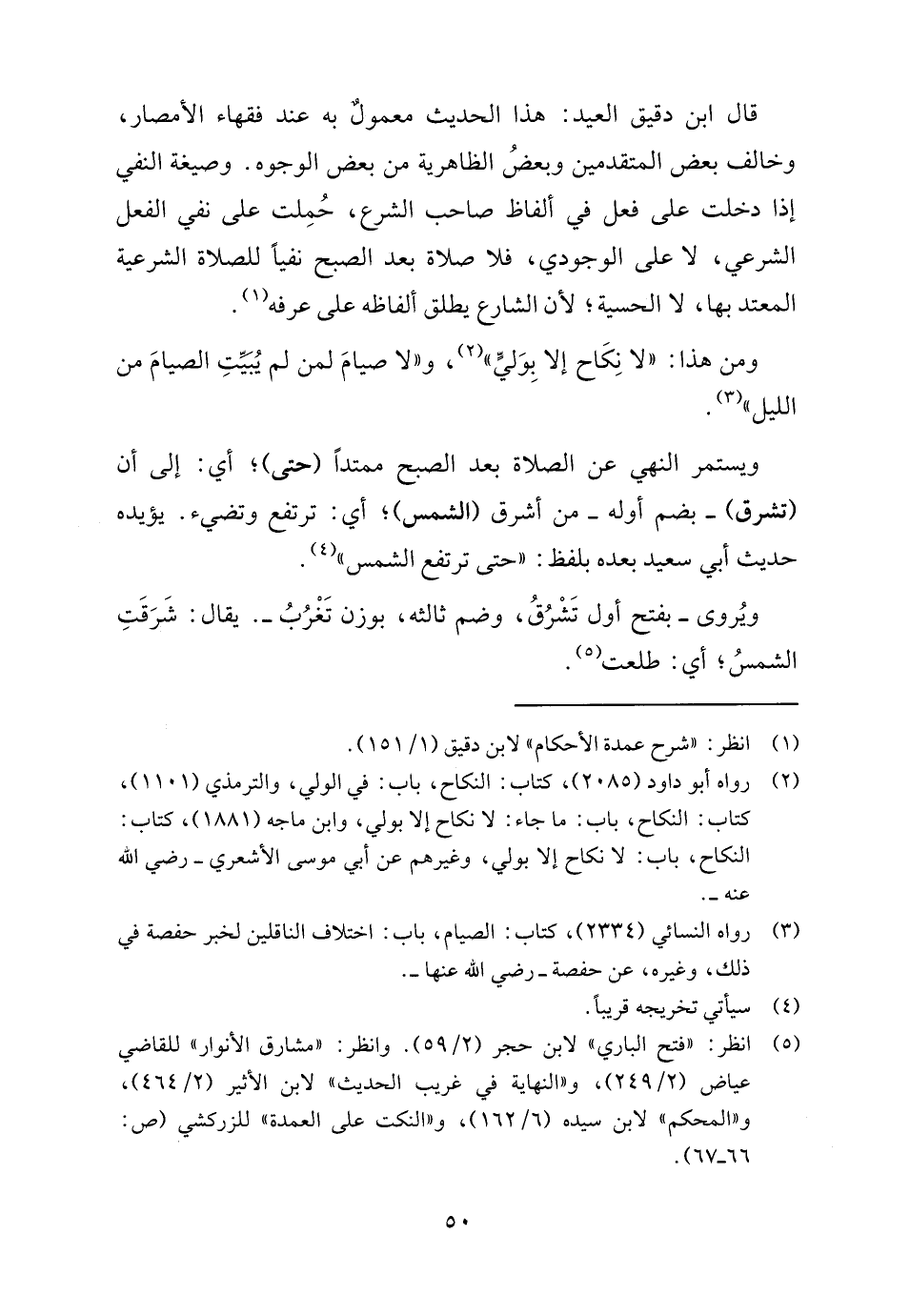 قال ابن دقيق العيد: هذا الحديث معمولٌ به عند فقهاء الأمصار، وخالف بعض المتقدمين وبعضُ الظاهرية من بعض الوجوه. وصيغة النفي إذا دخلت على فعل في ألفاظ صاحب الشرع، حُمِلت على نفي الفعل الشرعي، لا على الوجودي، فلا صلاة بعد الصبح نفيًا للصلاة الشرعية المعتد بها، لا الحسية؛ لأن الشارع يطلق ألفاظه على عرفه (١).