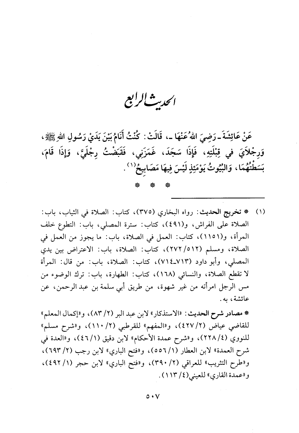 عَنْ عَائِشَةَ -رَضِيَ اللَّهُ عَنْهَا-، قَالَتْ: كُنْتُ أَنَامُ بَيْنَ يَدَيْ رَسُولِ اللَّهِ -صلى اللَّه عليه وسلم-، وَرِجْلَايَ في قِبْلَتِهِ، فَإذَا سَجَدَ، غَمَزَني، فَقَبَضْتُ رِجْلَيَّ، وإذَا قَامَ، بَسَطْتُهُمَا، وَالبيوتُ يَوْمَئِذٍ لَيْسَ فِيهَا مَصَابِيحُ (١).