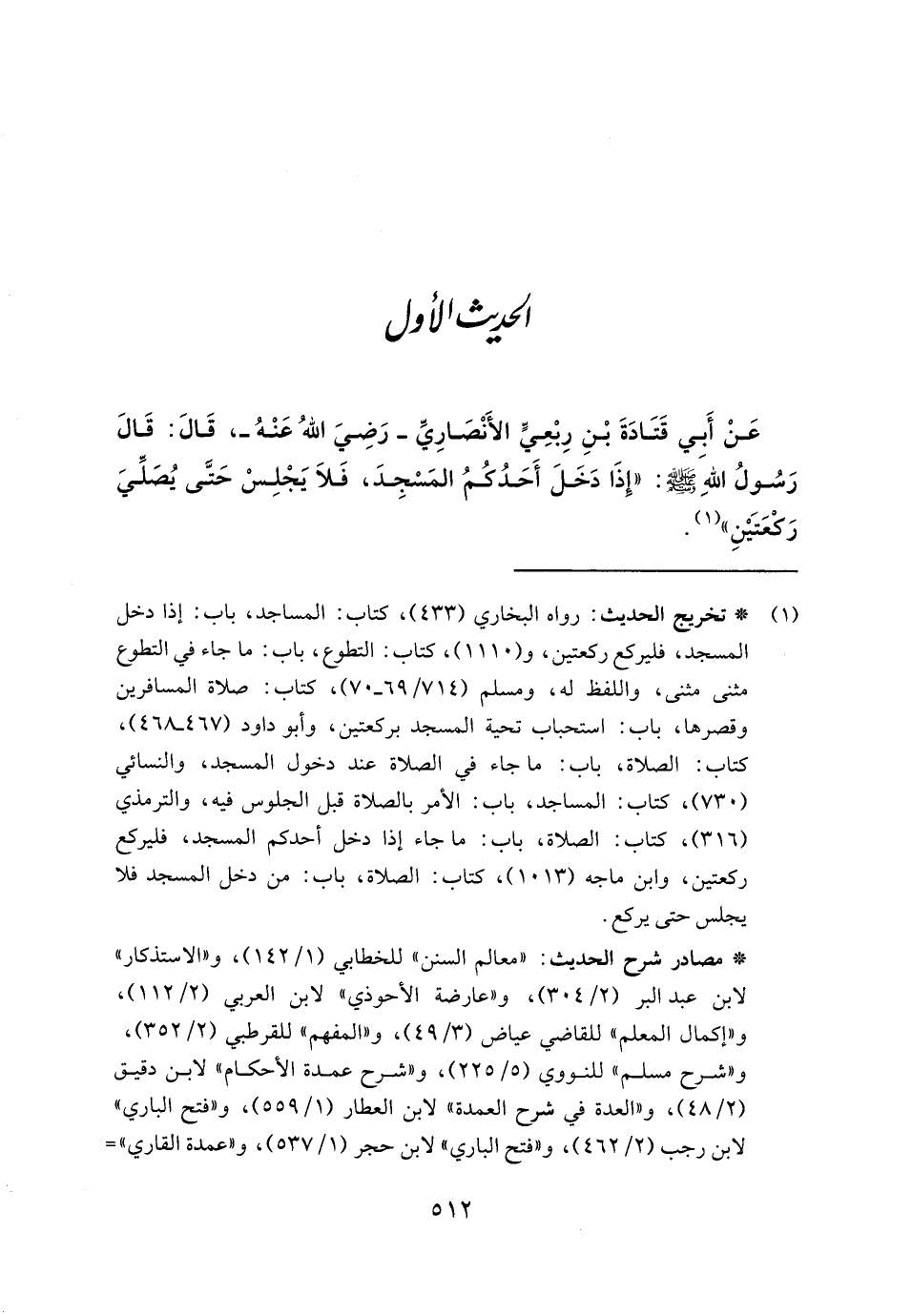 عَنْ أَبِي قَتَادَةَ بْنِ رِبْعِيٍّ الأَنْصَارِيِّ -رَضِيَ اللَّهُ عَنْهُ-، قَالَ: قَالَ رَسُولُ اللَّهِ -صلى اللَّه عليه وسلم-: "إِذَا دَخَلَ أَحَدُكُمُ المَسْجِدَ، فَلَا يَجْلِسْ حَتَّى يُصَلِّيَ رَكْعَتَيْنِ" (١).
