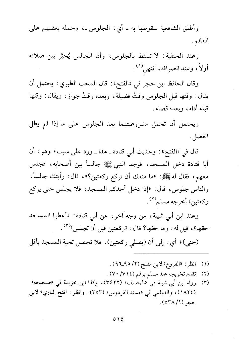 وعند ابن أبي شيبة، من وجه آخر، عن أبي قتادة: "أعطوا المساجد حقها"، قيل له: وما حقها؟ قال: "ركعتين قبل أن تجلس" (٣).