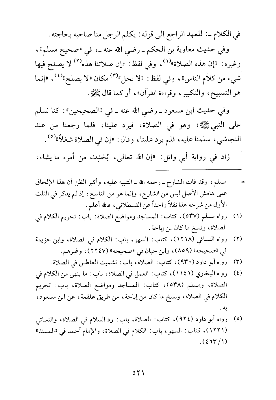 (١) رواه مسلم (٥٣٧)، كتاب: المساجد ومواضع الصلاة: باب: تحريم الكلام في الصلاة، ونسخ ما كان من إباحة.