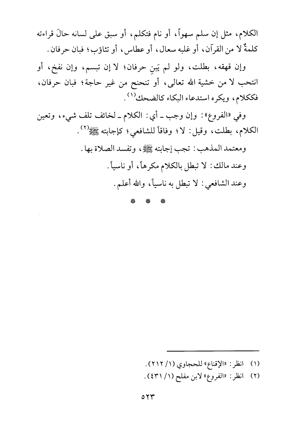 وفي "الفروع": وإن وجب -أي: الكلام- لخائف تلف شيء، وتعين الكلام، بطلت، وقيل: لا؛ وفاقًا للشافعي؛ كإجابته -صلى اللَّه عليه وسلم- (٢).