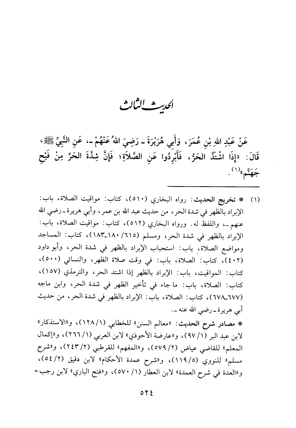 عَنْ عَبْدِ اللهِ بْنِ عُمَرَ، وَأَبِي هُرَيْرَةَ -رَضِيَ اللَّهُ عَنْهُمْ-، عَنِ النَّبِيِّ -صلى اللَّه عليه وسلم-، قَالَ: "إِذَا اشْتد الحَرُّ، فَأَبْرِدُوا عَنِ الصَّلَاةِ؛ فَإن شِدَّةَ الحَرِّ مِنْ فَيْحِ جَهَنَّم" (١).