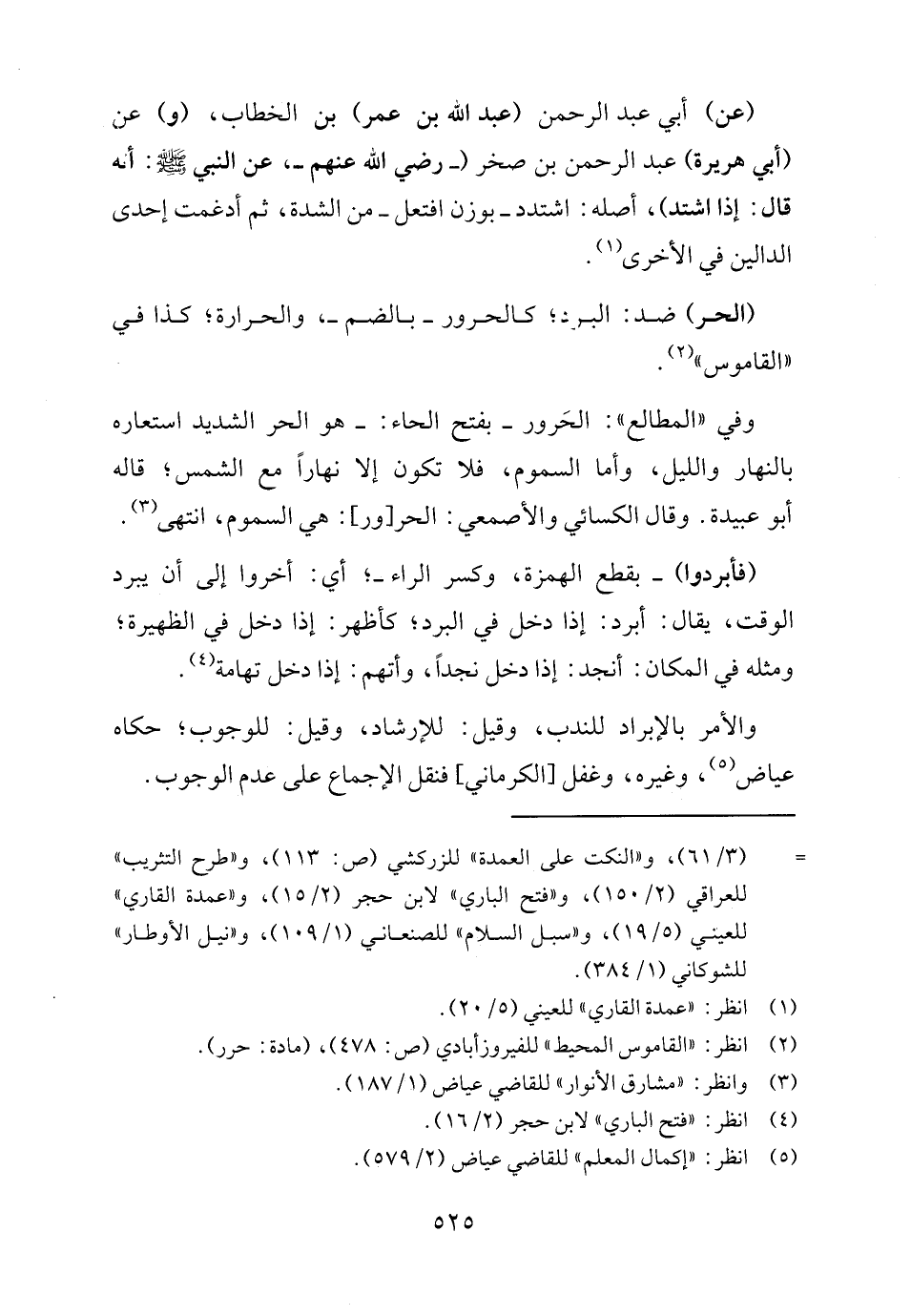 (عن) أبي عبد الرحمن (عبد اللَّه بن عمر) بن الخطاب، (و) عن، (أبي هريرة) عبد الرحمن بن صخر (-رضي اللَّه عنهم-، عن النبي -صلى اللَّه عليه وسلم-: أنه قال: إذا اشتد)، أصله: اشتدد -بوزن افتعل- من الشدة، ثم أدغمت إحدى الدالين في الأخرى (١).